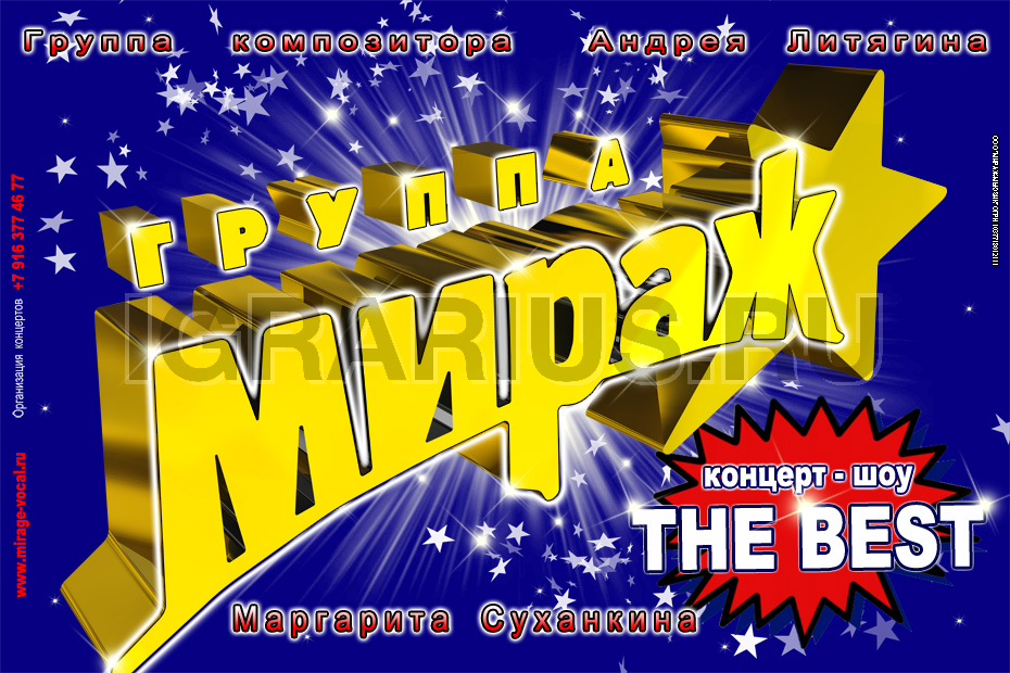 Концерты группы "МИРАЖ", в которых используются современ-ные технологии в свете, огромный экран, живой звук и одно из лучших лазерных шоу страны, проходят во многих городах России и ближнего зарубежья, а также в Германии, Израиле, США, Канаде.