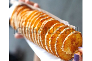 Необычный картофель, извивающийся спиралью по деревянному ша...