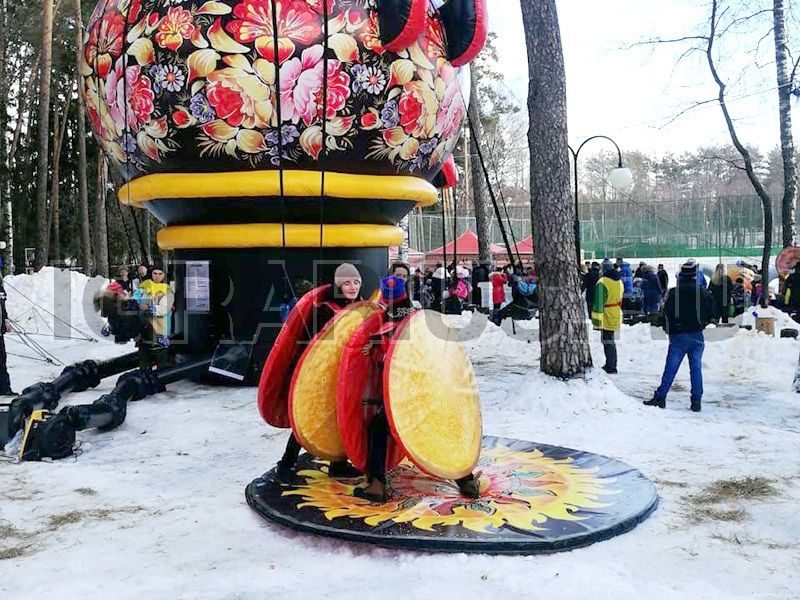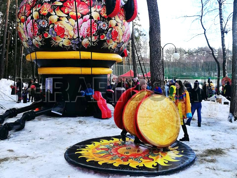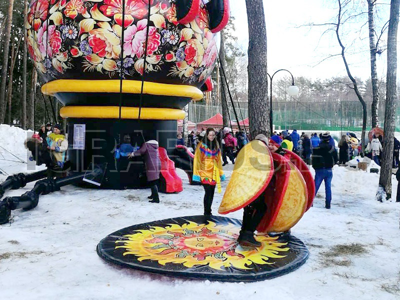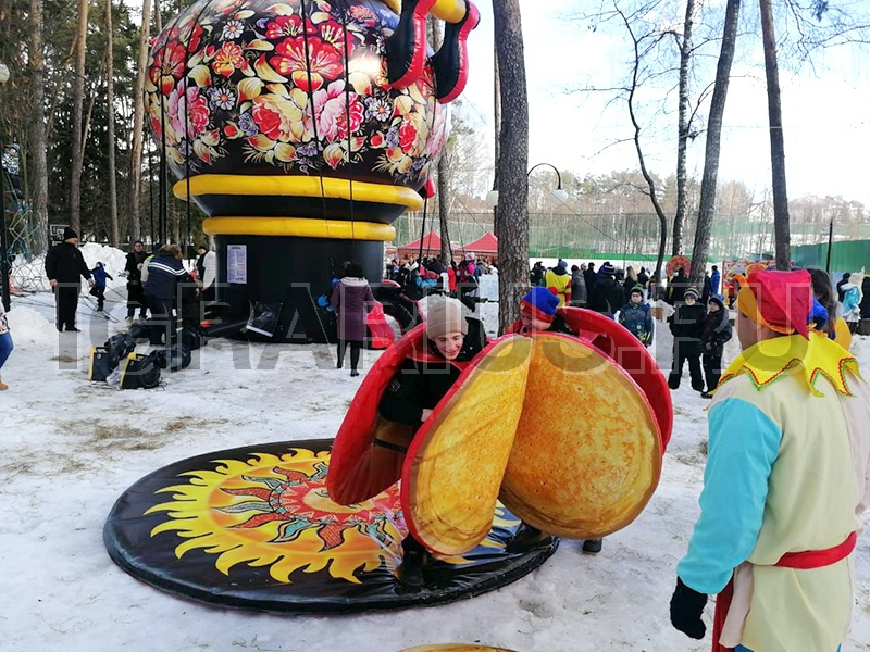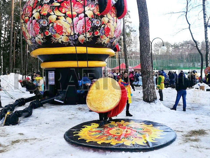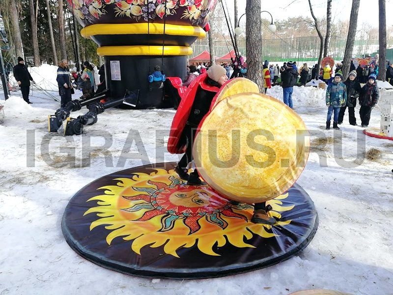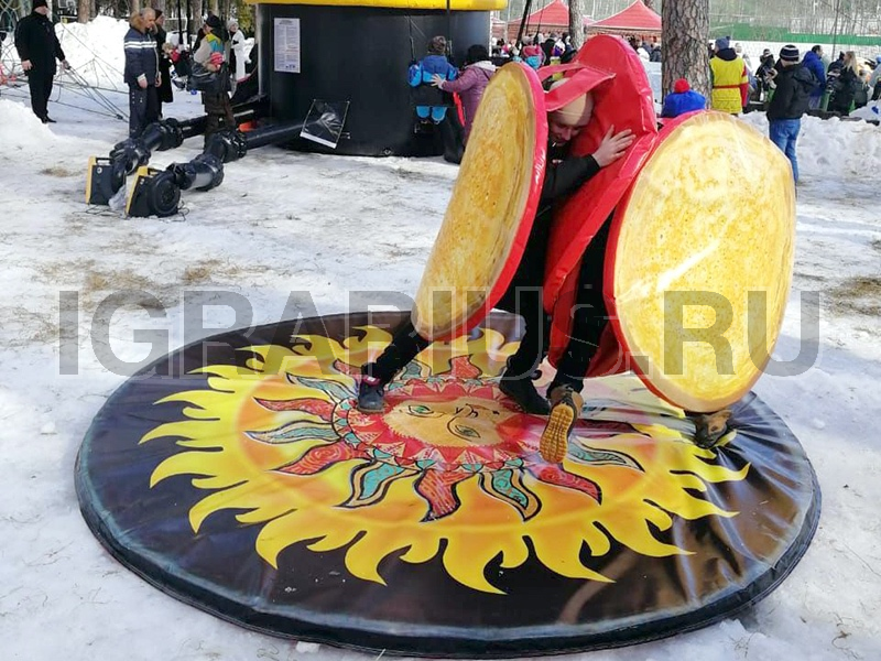 Участники на несколько минут становятся огромными блинами и борются за место на сковороде! Аттракцион «Блинная дуэль» отлично впишется в формат масленичных мероприятий, а также в мероприятие с русской народной тематикой. Также костюмы можно использовать для эстафет.