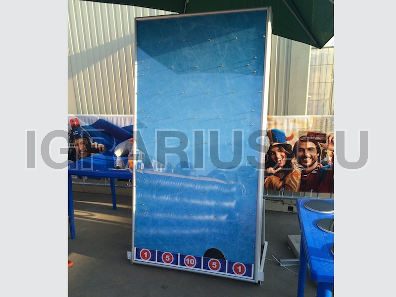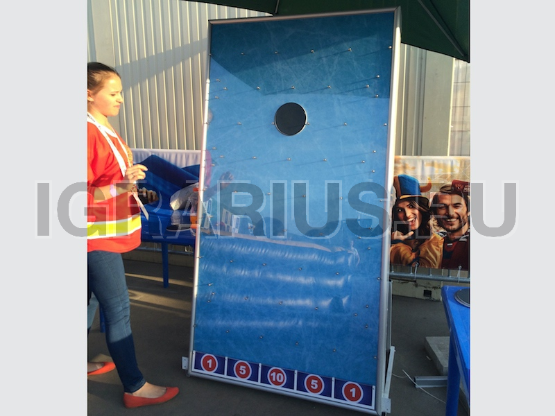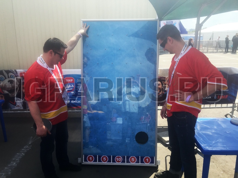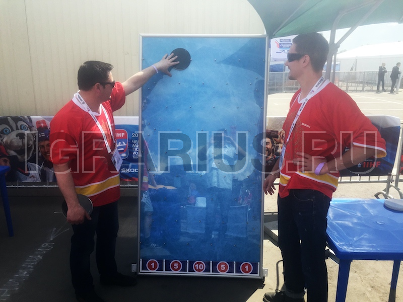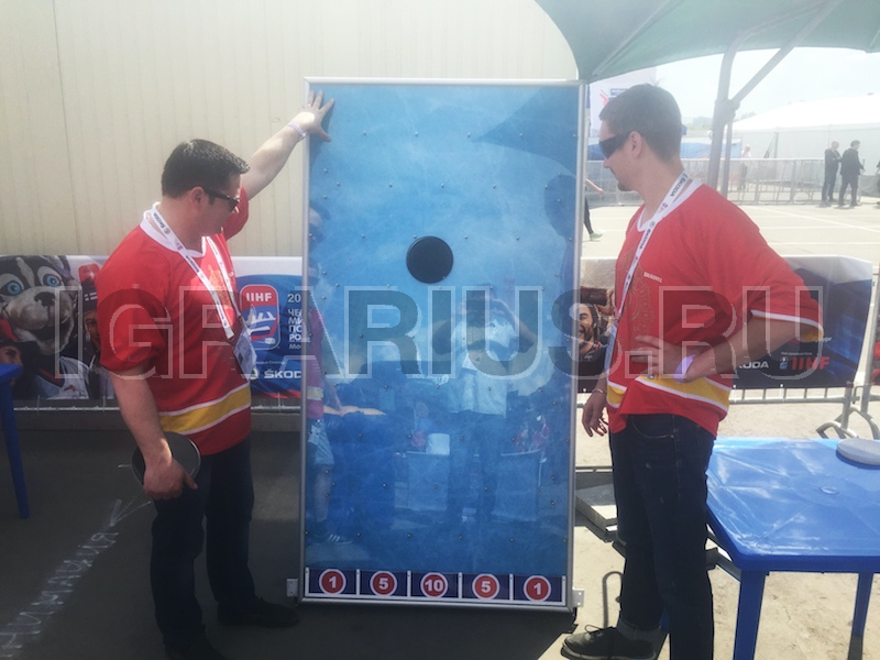 Отличный аттракцион для футбольных или хоккейных фан-зон. Игроку дается 5 попыток, надо, набрать максимальное количество баллов бросая шайбы с верхней точки игрового поля.