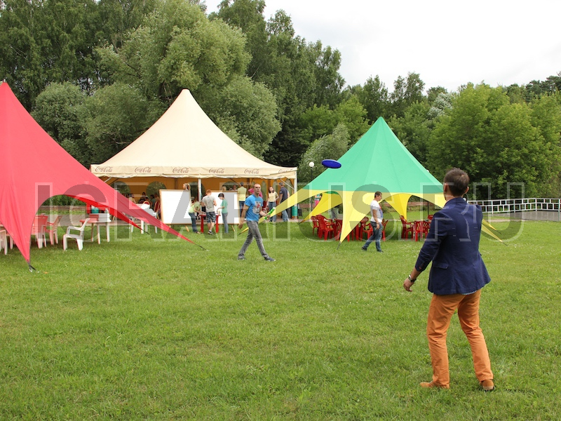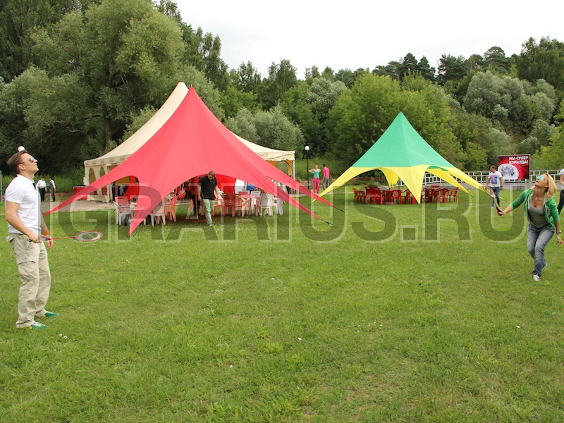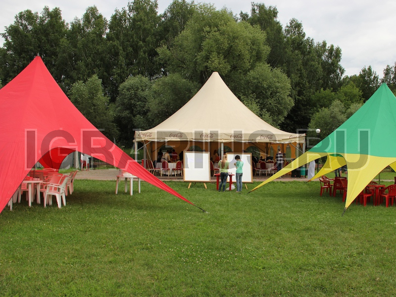 Очень мобильная и быстро устанавливаемая конструкция. Тент устанавливается на любой земляной поверхности. При посадочном варианте под тентом, возможно, разместить до 50 человек. При необходимости в комплект к тенту Вы можете заказать в аренду и пластиковую мебель.