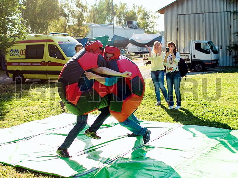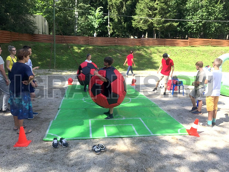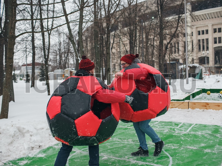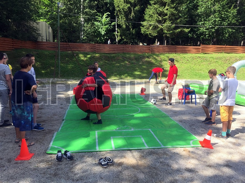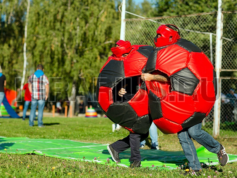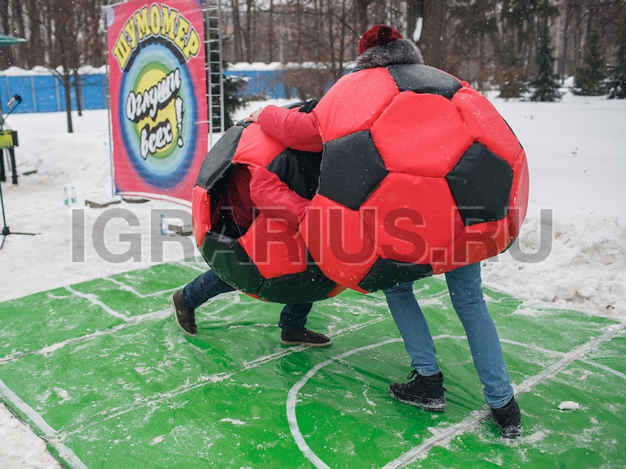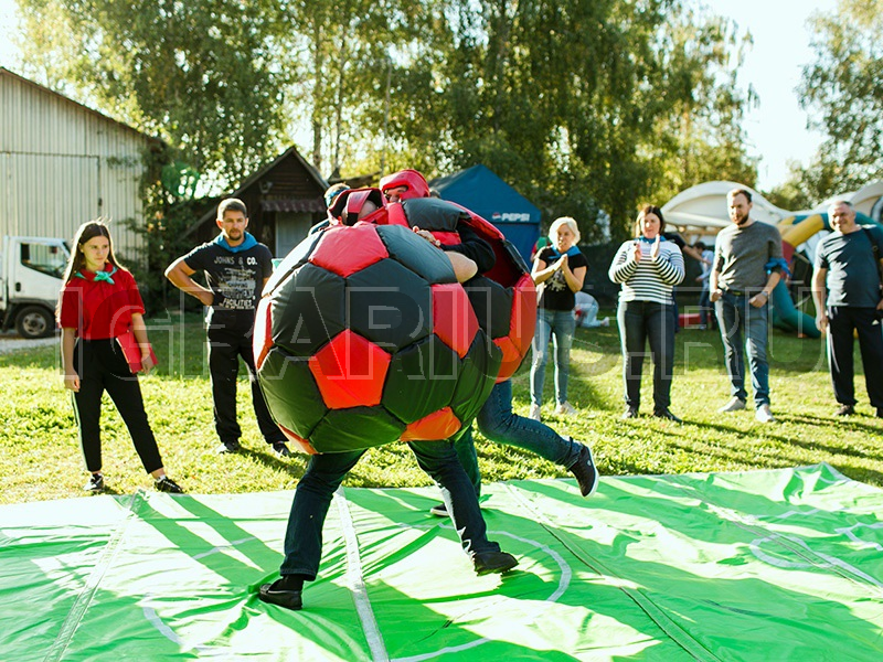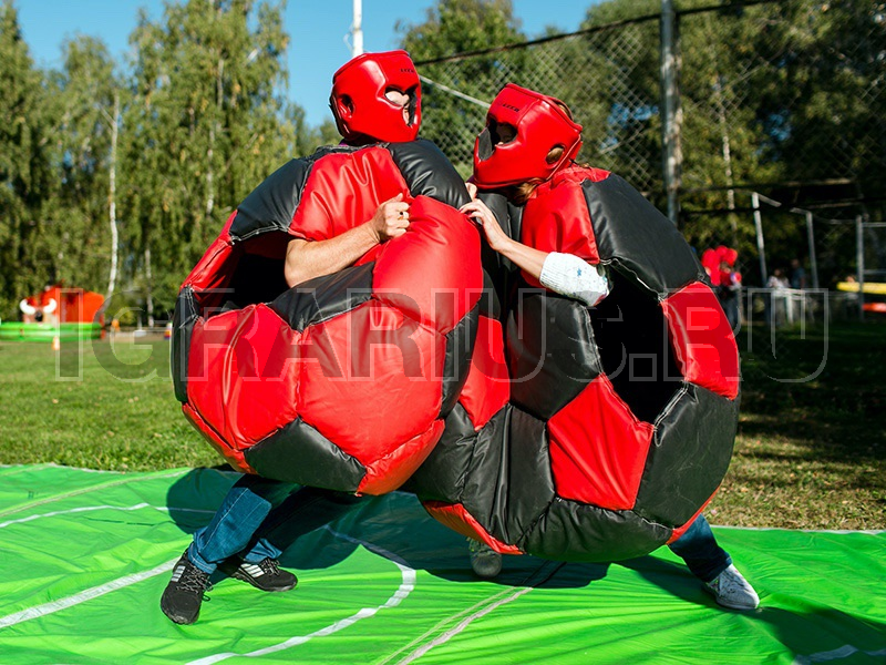 Участники одевают на себя костюмы футбольных мячей, а дальше правила как в обычном сумо. Задача вытолкнуть соперника за пределы площадки, которая представлена в виде мягкого футбольного поля.