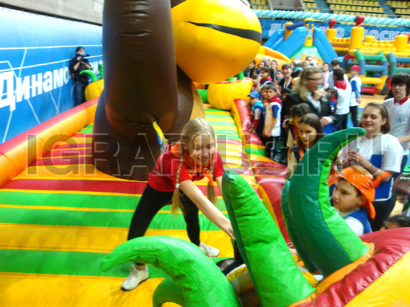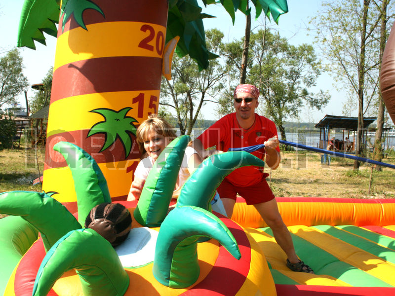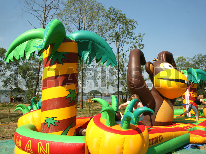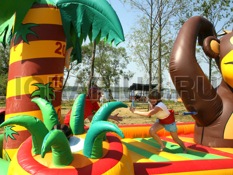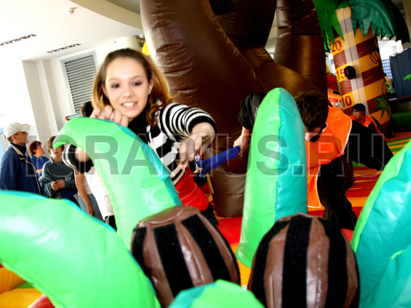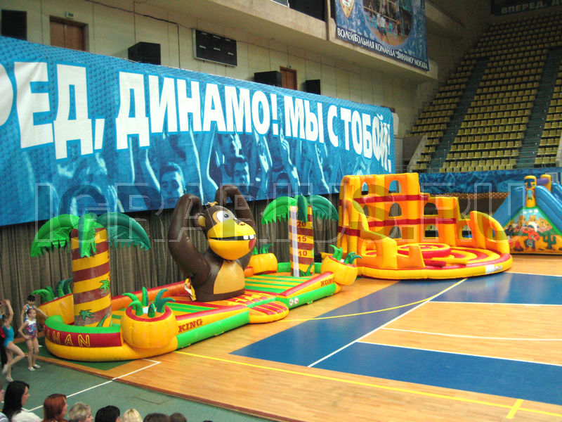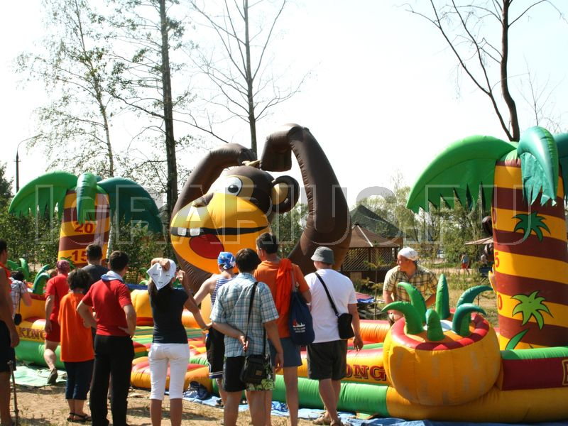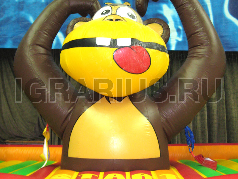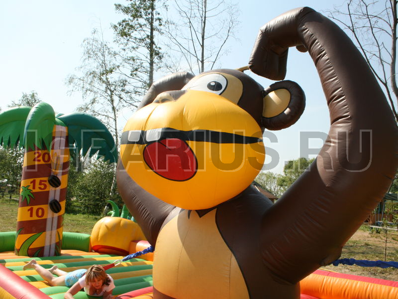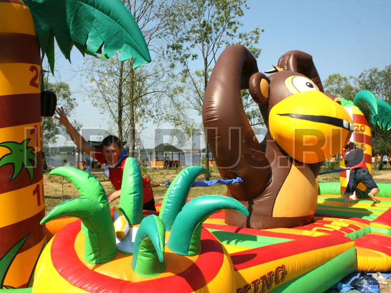 Банджи-ран Кинг-Конг - оригинальный и веселый аттракцион для состязаний. Бери скорее друга и беги от Кинг-Конга. Кто быстрее соберет все кокосы с пальм по бокам, тот и побеждает. Но тут всё не так просто: чтобы дотянуться до кокосов, придется приложить максимум усилий и проявить ловкость и смекалку. Не бойся, одолей Кинг-Конга! Стань Королем Джунглей!