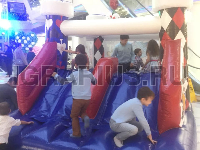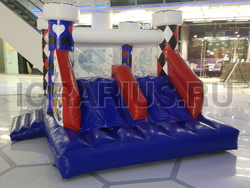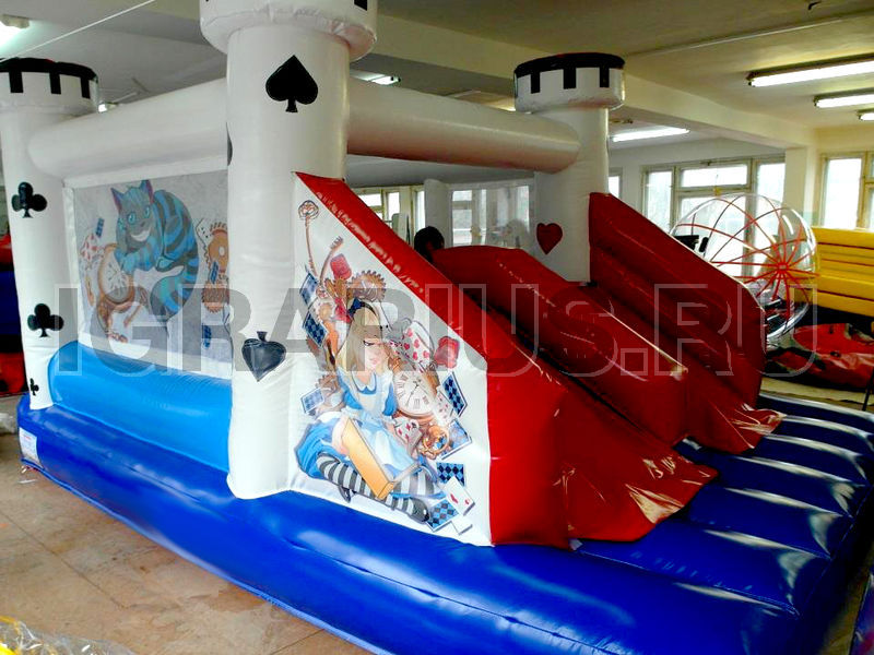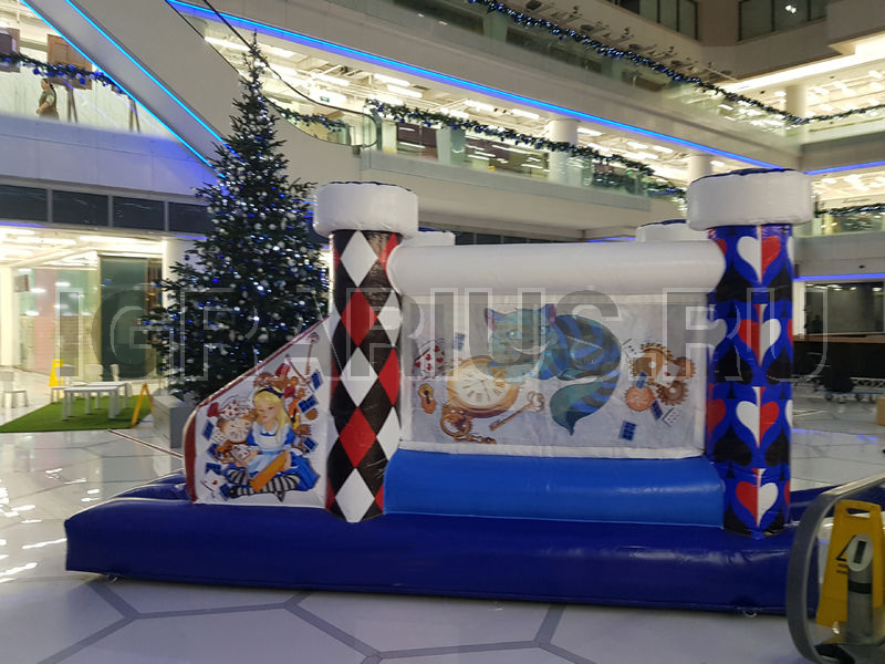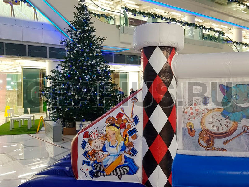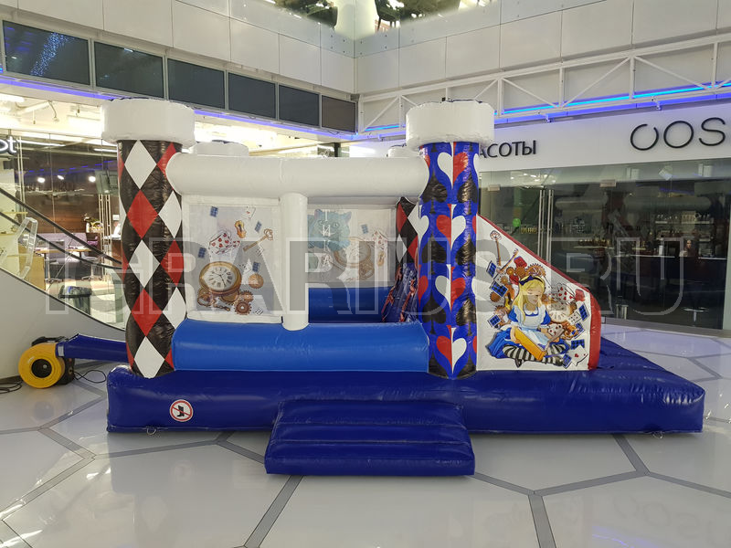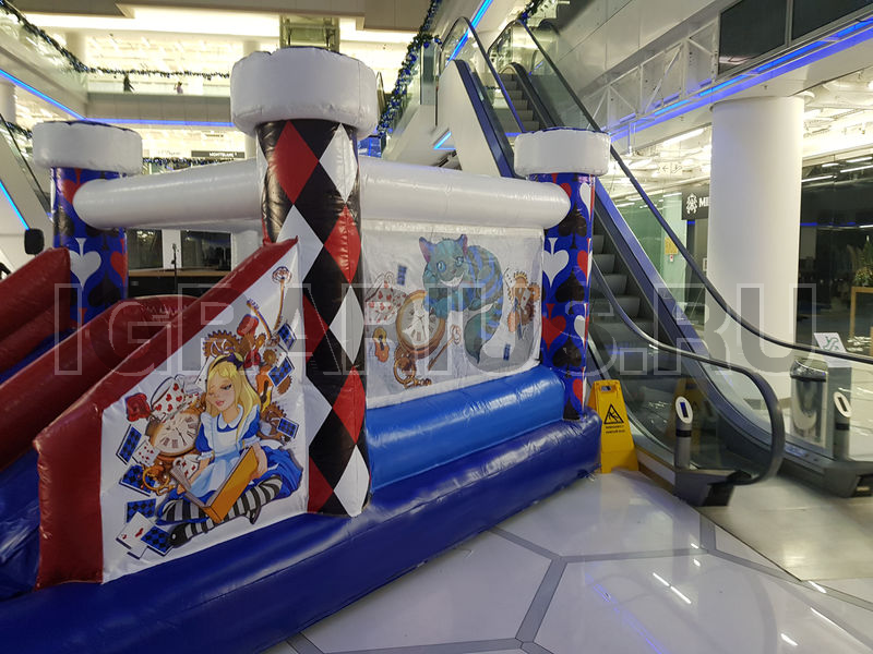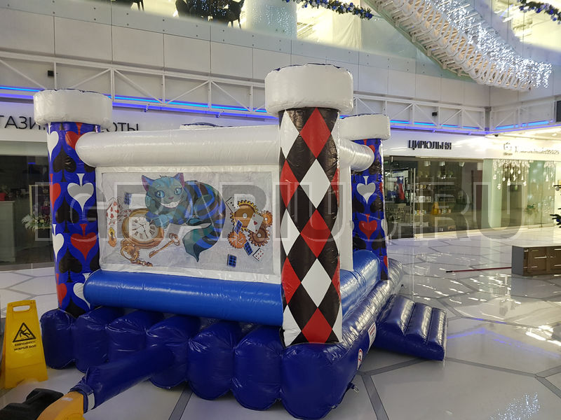 Любите чудеса и волшебство? Интересно познавать все новое? Окунитесь в атмосферу Зазеркалья, перенеситесь на время в другой мир. Надувной батут Алина в Зазеркалье выполнен в стиле замка, имеет четыре колонны и бортики, украшенные героями мультфильма "Алиса в стране чудес". Прыгай за белым кроликом на безумное чаепитие со Шляпником на надувном батуте!