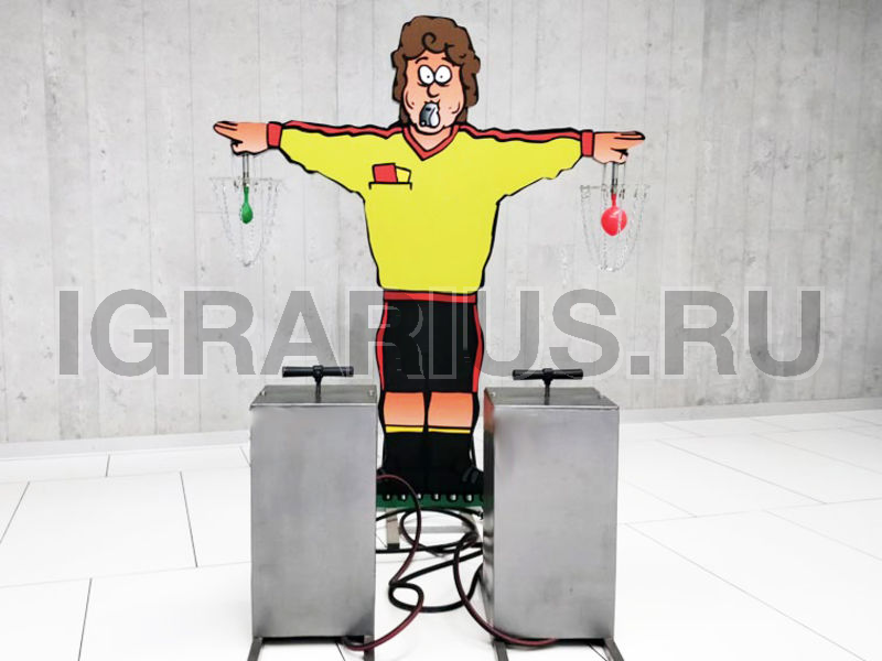 Кто хочет сразиться с соперником в необычном состязании или устроить шуточную жеребьевку? Тогда на центре поля вас ждет футбольный судья! Но в руках его не красные и желтые карточки, а специальные крепления для воздушных шаров - футбольных мячей. И, конечно, то, кто первый лопнет свой шарик, надувая его специальным насосом-помпой, тот и забьет Гол в воображаемые ворота соперника!