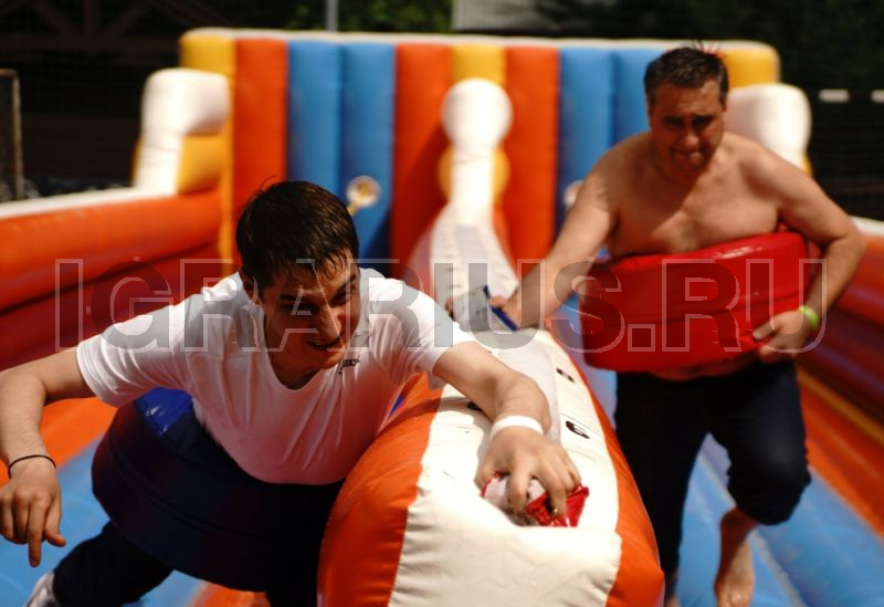 У нас для Вас есть очень весёлый аттракцион «Весёлые дорожки». Где из двух участников, каждый должен преодолеть максимально возможно расстояние по надувной дорожке и установить свою фишку на отметке как можно дальше, чем соперник.