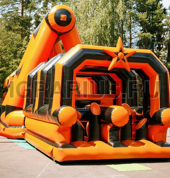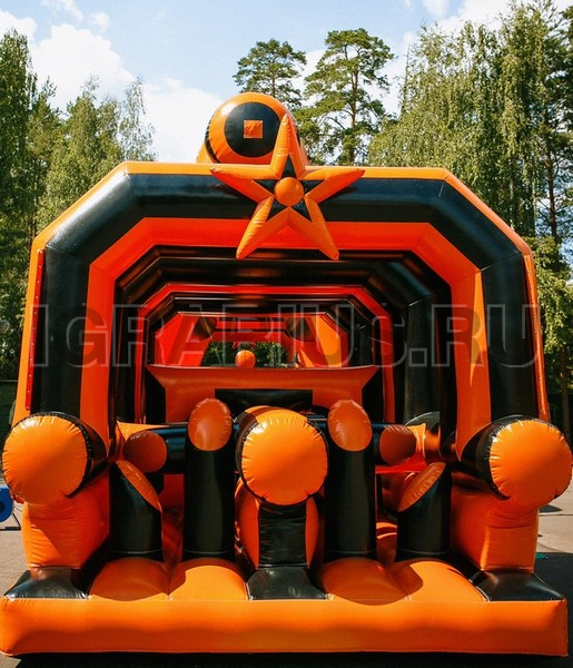 Надувная полоса препятствий в цветах Георгиевской ленты, которую мы предоставляем в аренду, это ещё одна оригинальная идея как провести спортивный праздник в военно-патриотическом стиле или игру Зарница на открытом воздухе или в спортивном зале.