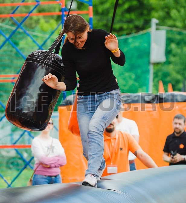 Пройти по надувному четырёхметровому «бревну» — специальному подиуму вдоль надувного плато — и сама по себе задача не из лёгких, а тут ещё, ввиду того, что описанная выше конструкция раскачивается от ваших перемещений, начинают раскачиваться и свисающие сверху «груши»; в общем, поход по бревну с препятствиями в виде этих самых груш — целый квест.
