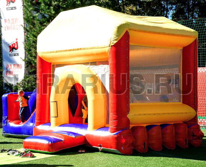 Наша надувная горка не простая — наша горка комбинированная! Мы вам предлагаем в аренду не просто батут с горкой, а целый игровой комплекс … здесь есть место и для беззаботных прыжков в форме домика, и горка для залихватского скатывания. А боковые поверхности домика можно забрендировать — подвесить баннеры с вашим логотипом или какими-нибудь яркими рисунками в концепте вашего мероприятия.