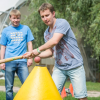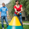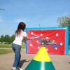Участнику необходимо битой ударить по мячику и попасть им в одну из целей. Говорим сразу, всё это не так легко, как может показаться.