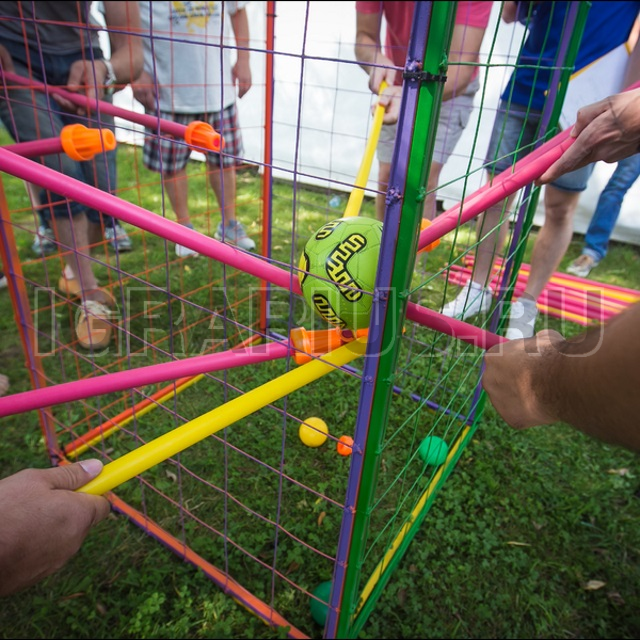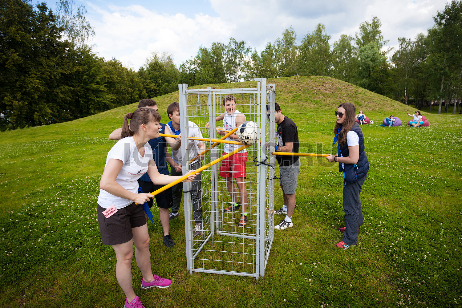 Перед вами клетка с достаточно просторными ячейками, у вас в руках палка вроде черенка от лопаты, на дне клетки мяч. Задача – вытащить мяч из клетки посредством отверстия, имеющегося на крыше конструкции. Одновременные похлопывания палками по мячу, а также слаженное его пинание вверх успеха не принесут – проверено. Необходимо тщательно, сообразуя свои действия с усилиями партнёров, шаг за шагом перемещать мяч вверх, манипулируя черенком, передвигая его из отверстия в отверстие.