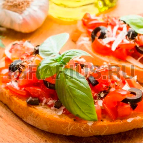 Состав брускетты с томатами: багет поджаренный на оливковом масле, орегано, базилик, томаты, чеснок