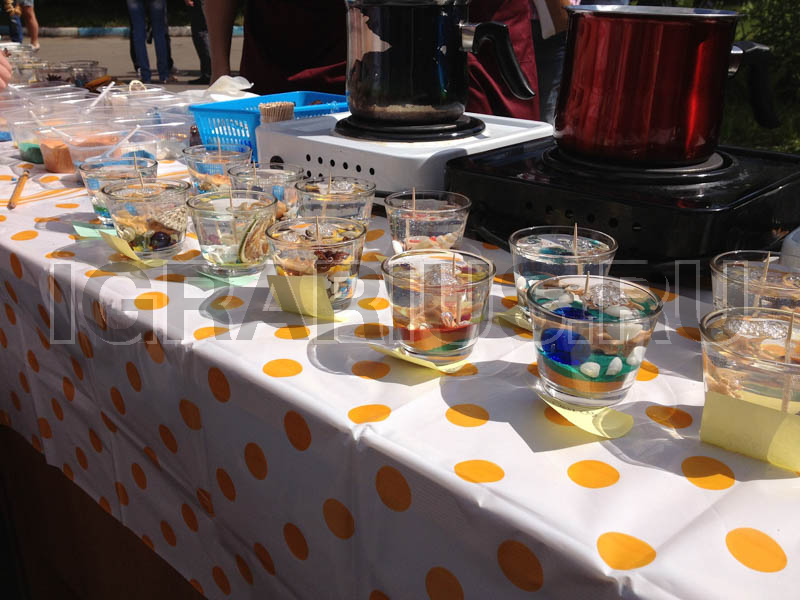 Предлагаем изготовить свечу из геля. Именно у этого вещества целый ряд преимуществ: свечи горят в 3-5 раз дольше парафиновых, не текут, не требуют подсвечника, так как гель испаряется из стеклянной ёмкости, которая как раз и служит подсвечником. Прозрачный гель с пузырьками удивительно красиво преломляет свет пламени при горении, имеет отличный внешний вид, позволяет получить много интересных фигурных картин, начиная с плавающих бусинок и заканчивая имитацией подводного мира. Каждый участник может изготовить из глицеринового геля и различных наполнителей (ракушек, сухоцветов, бусин, глиттеров, цветного песка и т.д.) уникальную свечу, которая будет радовать глаз и долго согревать своим теплом. В свечу можно добавить аромат. Заливается он в стеклянные бокалы, фужеры, небольшие вазы, которые смотрятся очень оригинально.