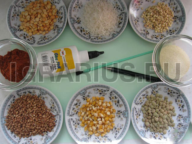- Фоторамки, семена, крупа, зерна, карандаш, клей ПВА, кисти