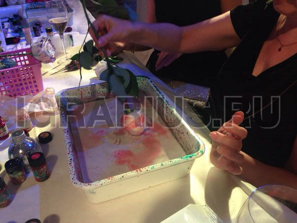 Мастер-класс родился в пик популярности мюзикла Призрак оперы и очень полюбился дамам, несмотря, казалось бы, на излишнее воздействие на живой цветок. Роза и вправду начинает играть другими красками и, конечно, выглядит элегантной. Сам процесс достаточно быстрый и несложный — капли красок капают на поверхность воды, а потом с помощью шила или деревянной шпажки эти капли разводят. Эти разводы переносят на цветок, окуная его в рисунок. Чаще используются красные розы, золотая, серебряная, белая, бирюзовая и изумрудная краска. Процесс может быть непредсказуемым и достаточно увлекательным. Остается дождаться, когда высохнет изделие и забрать своего спутника с собой!