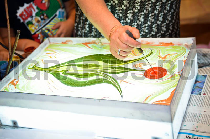 Эбру – это искусство рисования на воде! «Танцующие краски», «облака и ветер», «плавающие краски», «бумага с облаками», «волнообразная бумага», – так по-разному называют искусство эбру в странах Востока. В Европе же просто говорят – «турецкая бумага», так как впервые с этим изящными, красивыми картинами европейцы встретились именно в Стамбуле. Это именно мастер-класс, а не показательное выступление с подсветками. Мы показываем технику рисования на воде. В мастер-классе используется специальная химическая жидкость-загуститель, маслянистые краски, широкие кисти и шило. Сначала создается красивый мраморный фон, а поверх уже рисунок, явно видимый на этом фоне — цветы, птицы, орнаменты, целые картины и прочее. На готовый рисунок накладывается плотный лист бумаги, краска отпечатывается на листе и после высыхания бумаги — картина готова. Рисунок Эбру можно наносить на кожу, картон, шелк, пластмассу, дерево и другие материалы. Создать две одинаковых картины просто невозможно! Вообще, предугадать как растекутся краски, невозможно. Поэтому даже у мастера каждый новый рисунок — это новый эксперимент. Мастер-класс — терапевтический, благотворно влияет на нервную систему.