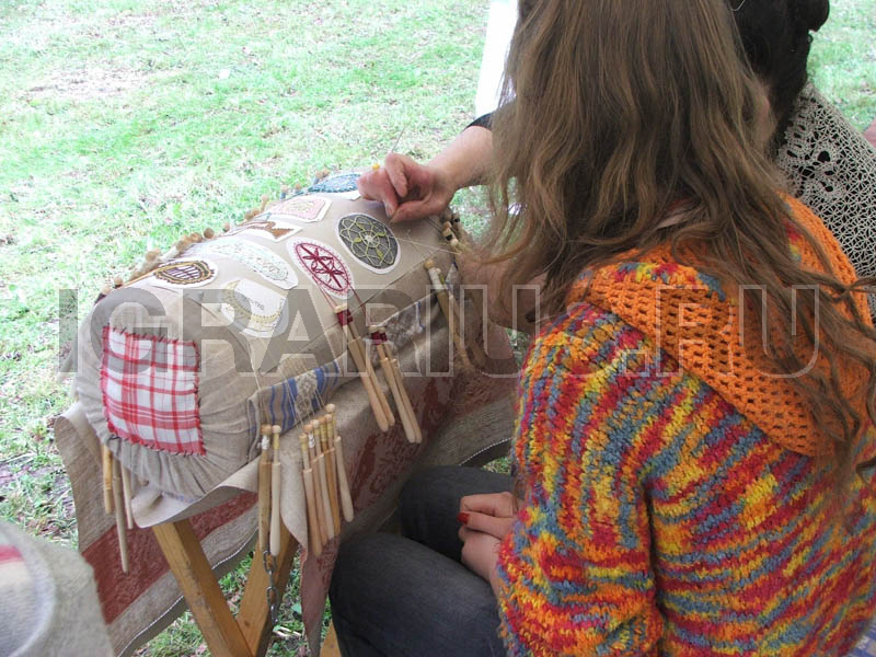 На Руси кружева на коклюшках известны с ХIII в. Существует вологодское, елецкое, киришское, вятское, московское, галицкое, рязанское кружево. Символика — особенность кружева. Его использовали как оберег, оно защищало человека в самых уязвимых (открытых) местах: шея, голова, руки. Каждый узор и цвет имел свое значение. Инструменты для плетения кружев: подушка-валик, образец кружевного рисунка – сколок, коклюшки (деревянные палочки с шейкой, на которую наматывается нить), булавки с маленькой головкой, вязальный крючок. Сколок служит канвой для плетения кружев. Узор на сколке наколот или напечатан точками, в которые должны втыкаться булавки для образования кружевного узора. Есть разные способы коклюшечного кружева: сцепное, парное, численное кружево. Процесс плетения сложный, многодневный, трудоёмкий и происходит в несколько этапов. Поэтому для наших гостей мы специально заготовили практически готовые изделия-кружева (бабочка, цветок, месяц, солнце, узор). Остается доплести буквально по 1 см., понять сущность и красоту искусства и, конечно, забрать с собой готовое изделие.