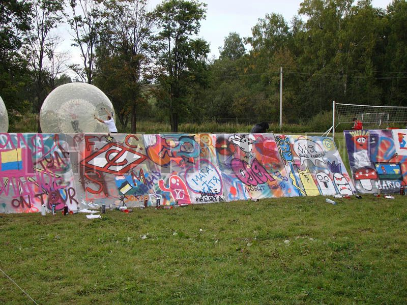 Граффити (от итал. — царапать) — изображения, рисунки или надписи, выцарапанные, написанные или нарисованные краской или чернилами на стенах и других поверхностях, известны с глубокой древности в странах Древнего Востока, в Греции, в Риме. Зарождение отечественного граффити движения произошло в 1980-х годах в СССР, а к концу 1990-х приобрело массовый характер в среде молодёжи. Рисуют граффити с помощью аэрозольной краски — самый главный и необходимый инструмент. Значение слова «граффити» со временем стало обозначать любую графику, нанесенную на поверхность. Для многих компаний стало традицией оставлять надписи с пожеланиями или просто датой события, логотипом и названием фирмы на плакате во время корпоративного мероприятия…На роспись всего щита может уйти время всего мероприятия, а может и час, всё зависит от желания гостей рисовать. Для безопасности наши мастера привозят с собой перчатки, защитные маски, средства гигиены. Палитра красок до 30 цветов.