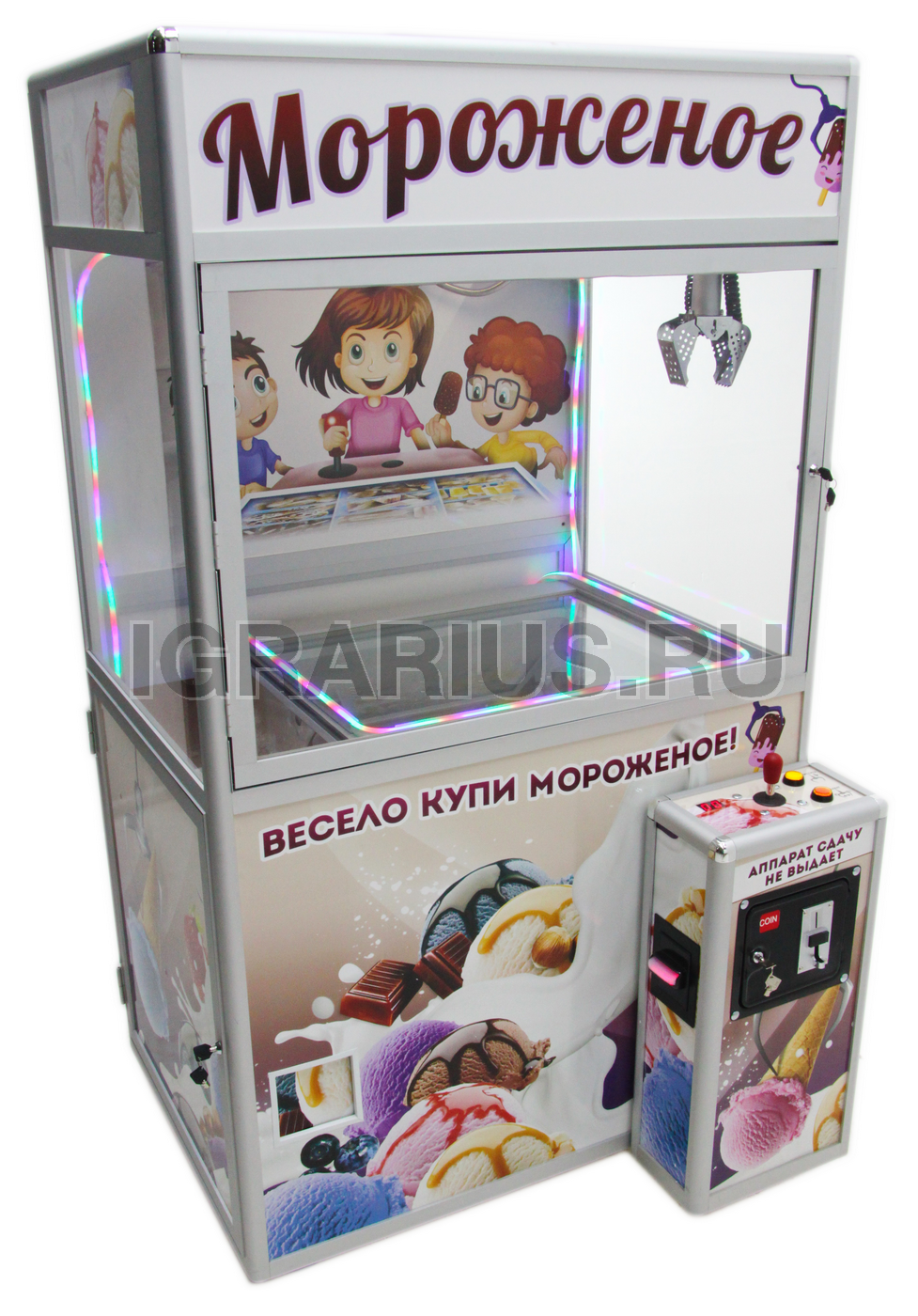 После старта игры, крышка морозильного ларя открывается, захват перемещается в центр автомата. Управляя джойстиком и двумя кнопками опускание и захват покупатель весело достает мороженное. В течении трех минут у покупателя есть возможность самостоятельно достать мороженое, если не получается, то автомат сам достанет мороженое из ларя. Мороженое бережно доставляется в окно выдачи.