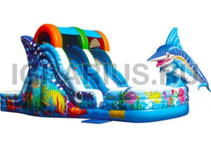 Огромная батутная горка Океан отличное решение для детского праздника. Из-за яркого оформления она напоминает морской риф с разноцветными рыбками, которых охраняет надувная рыба-меч. Вашему малышу понравиться скатываться с горки, как на морских волнах и он на долго запомнит батут Океан.