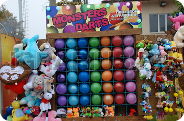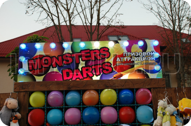 Аттракцион “Monsters Darts” напоминает доску, усеянную пузырями из разноцветной жевательной резинки. Но это вовсе не пузыри, а воздушные шарики, которые от удара дротика умелого стрелка лопаются с задорным хлопком. Чем больше шариков поражено - тем выше вероятность получения приятного подарка. “Monsters Darts” - то, что нужно, чтобы праздник наполнился духом безобидного озорства и веселья!