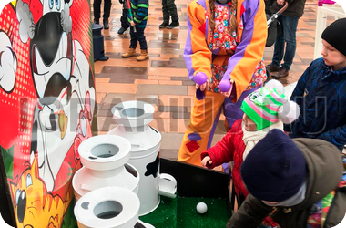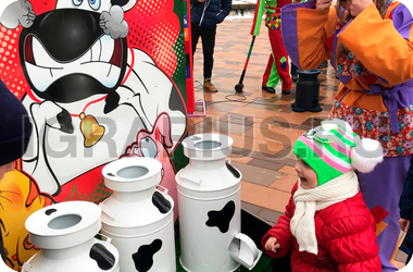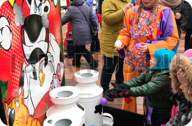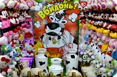 Помните тех потрясающих бычков из мультфильма “Рога и копыта”, соревновавшихся в меткости струй молока? Создатели аттракциона “Вбидонь” наверняка вдохновлялись героями этого мультика, создавая свою игру! Правила крайне просты: с небольшого расстояния необходимо забросить мячик в один из бидонов коровьей окраски. Чем больше попаданий - тем выше вероятность получения приза! Испытай свою меткость и точность с весёлым аттракционом “Вбидонь” и вспомни любимый мультфильм!