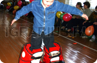 Гигантские ботинки хорошо разнообразят стандартную эстафету. Прохождение дистанции будет гораздо ярче и интереснее, если на ноги игрока надеты огромные пёстрые кроссовки, которые усложняют движение и добавляют азарта! Вы уже давно знаете, кто в Вашей компании быстрее всех бегает и дальше всех прыгает? Быть может, гигантские ботинки смогут изменить ситуацию?