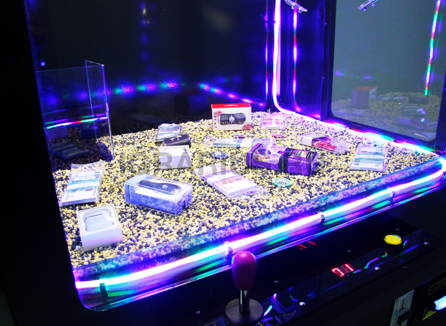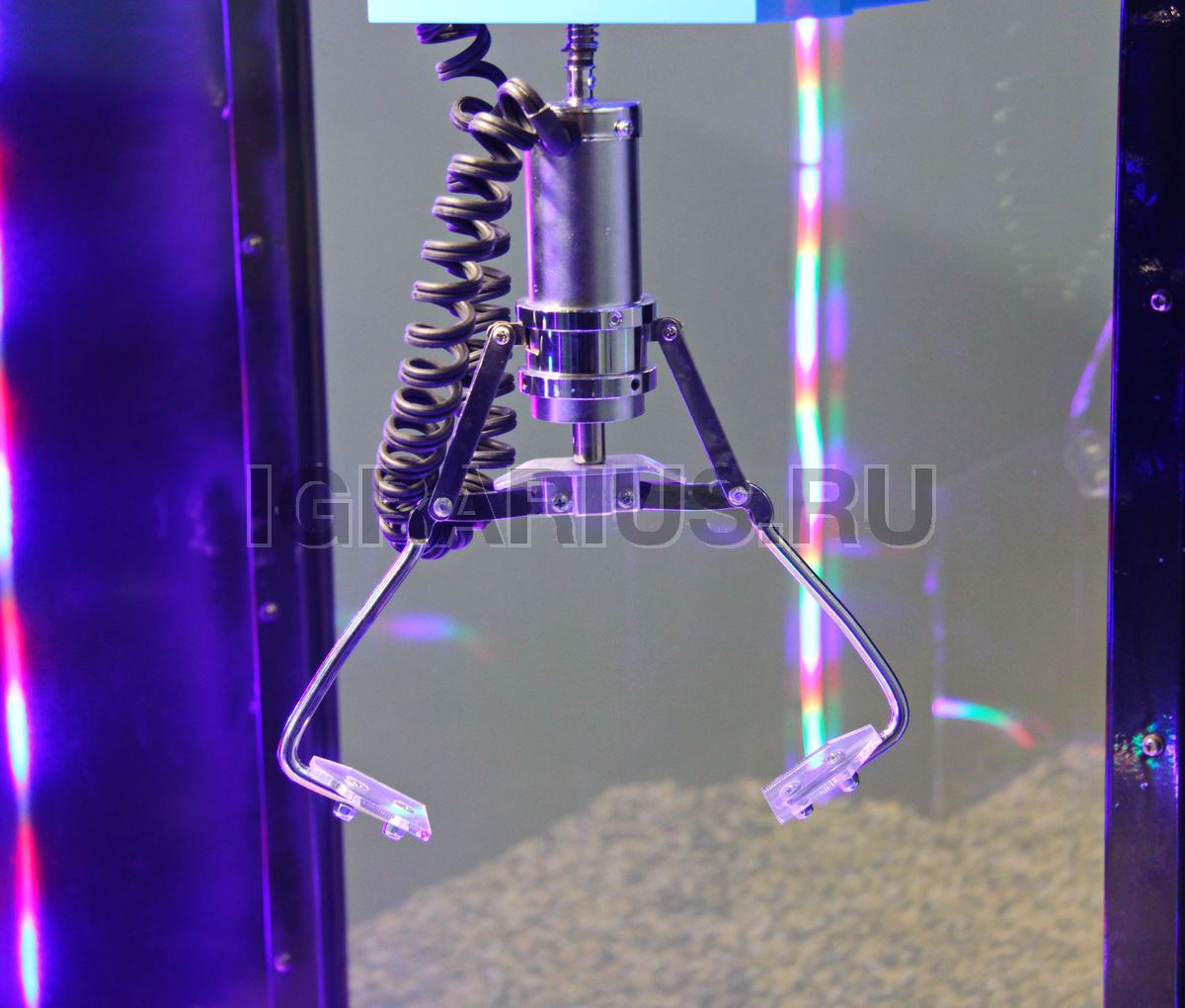 После оплаты, управляя джойстиком надо навезти клешню над призом, нажать кнопку и удерживать ее. Клешня поедет в низ. Отпустив кнопку клешня закроется. Задача подхватить дорогой приз и отвезти в призовое окно.