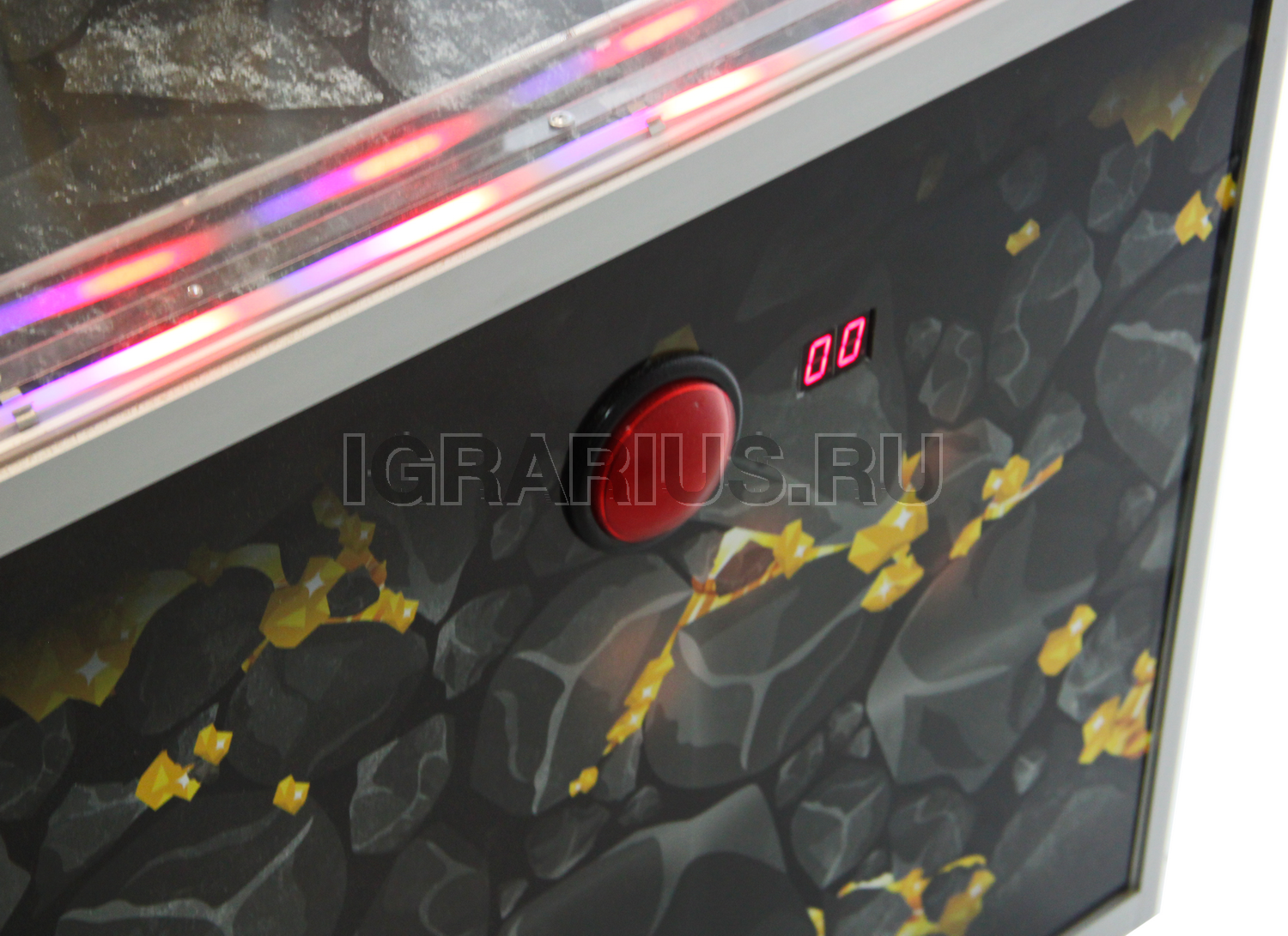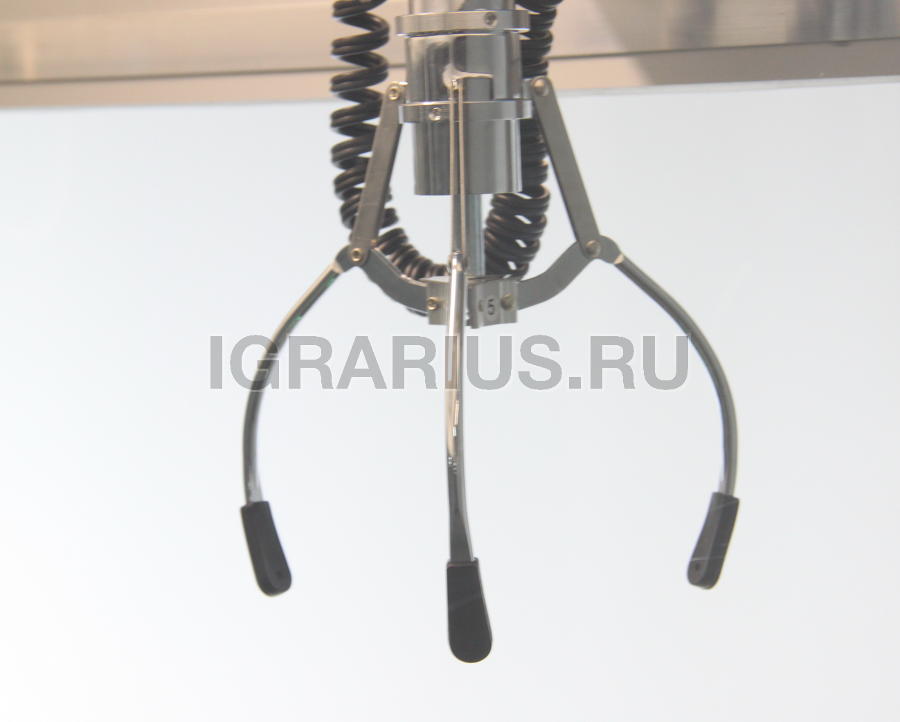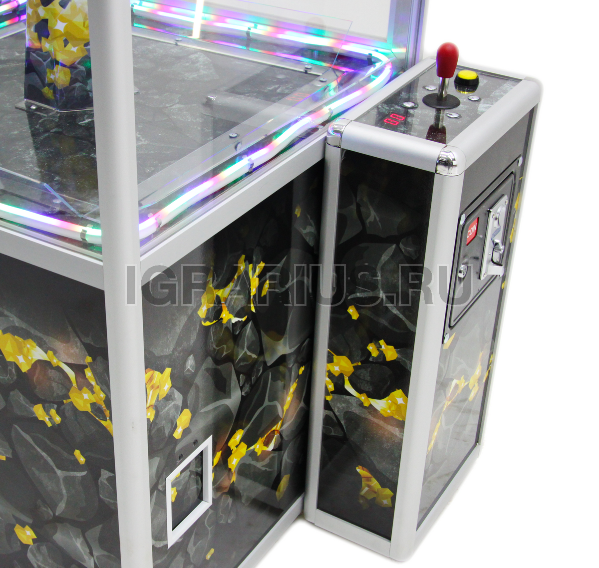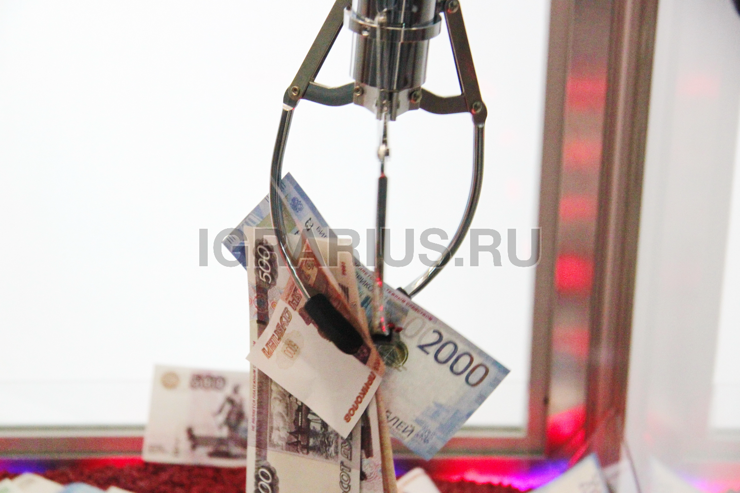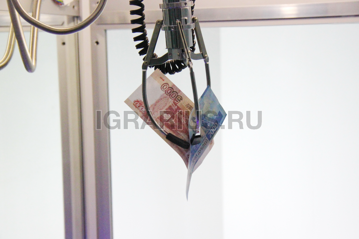 После оплаты через купюроприемник, купюра падает на игровое поле. Клешня начинает ходит произвольно в разные стороны. Первое нажатие кнопки - клешня поедет в низ и схватить кучу купюр. Клешня с зажатыми купюрами двигается в случайных направлениях 10 секунд. Второе нажатие кнопки - клешня раскрывается и деньги падают в низ. При удачном попадание в лузу, купюра забирается в призовом окне.