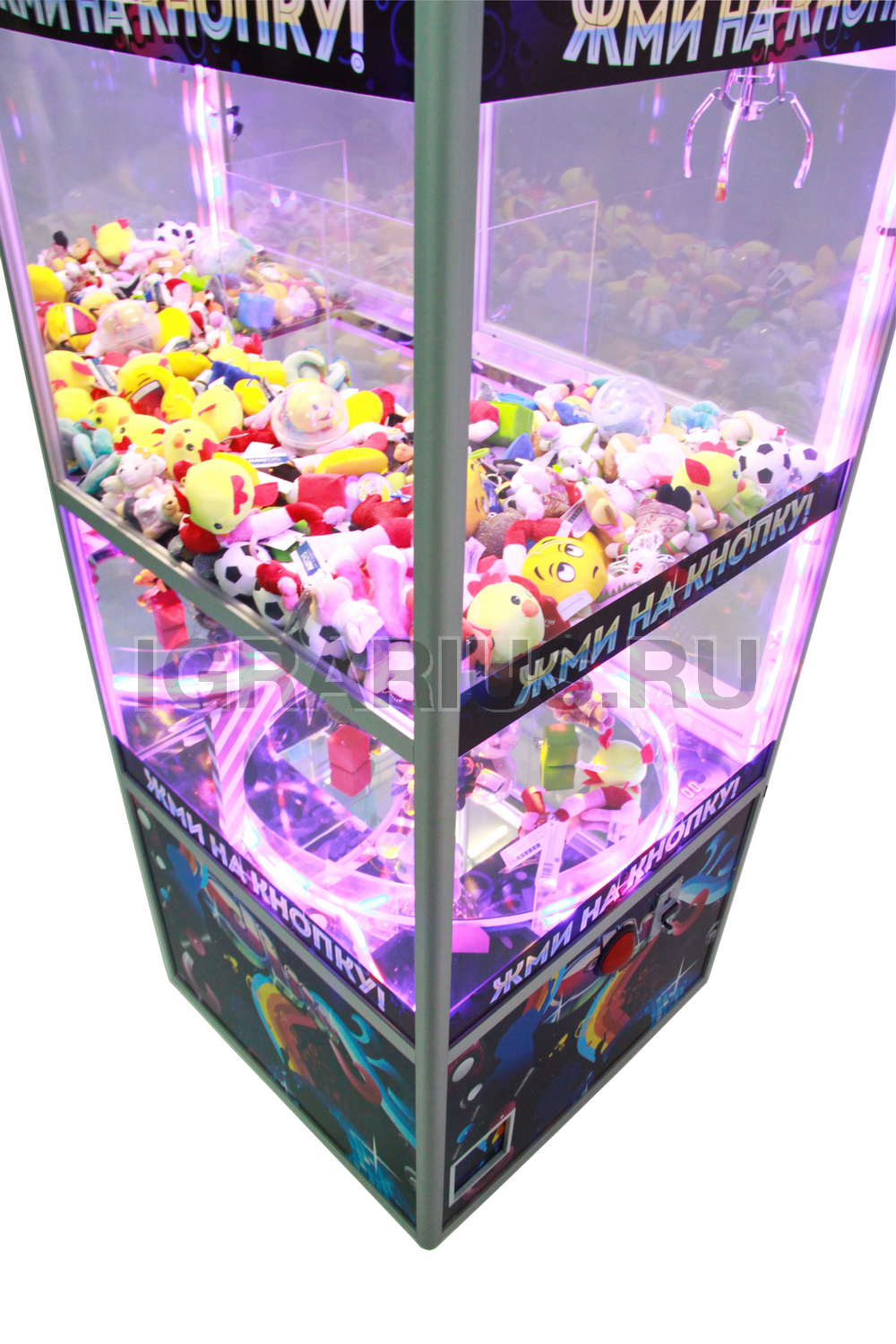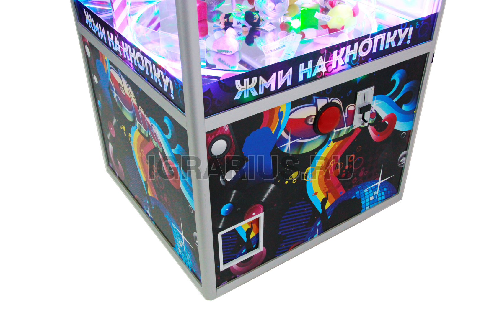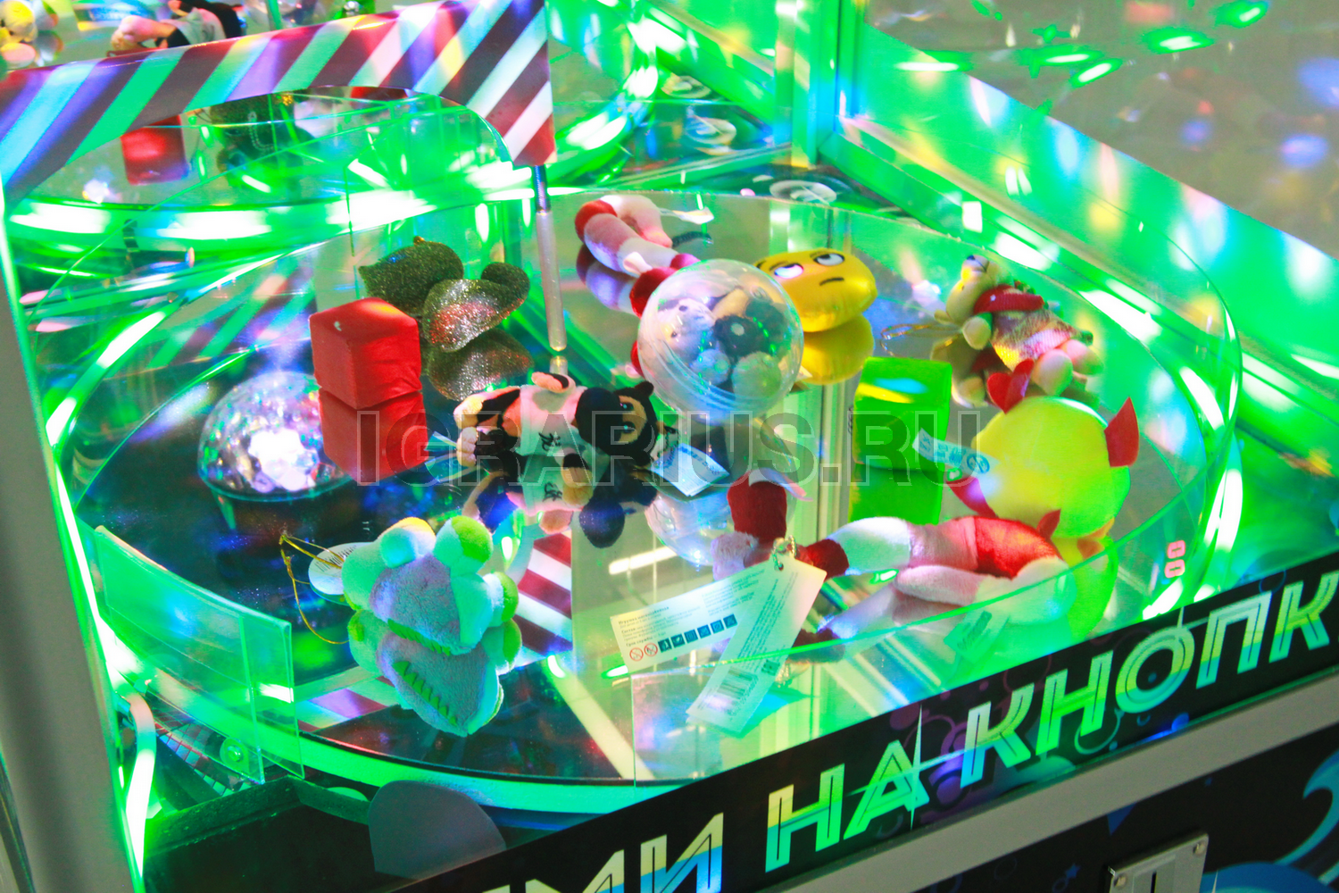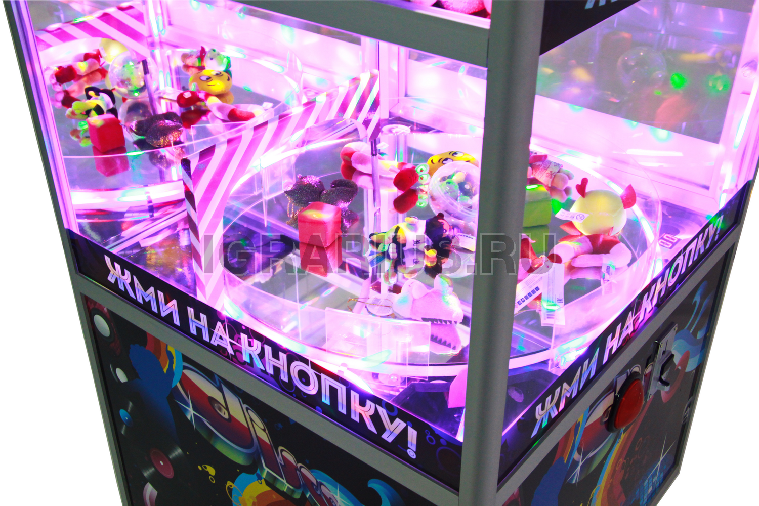 Второе нажатие кнопки: толкатель поедет в сторону призового окна, и при точном попадании, столкнет приз.