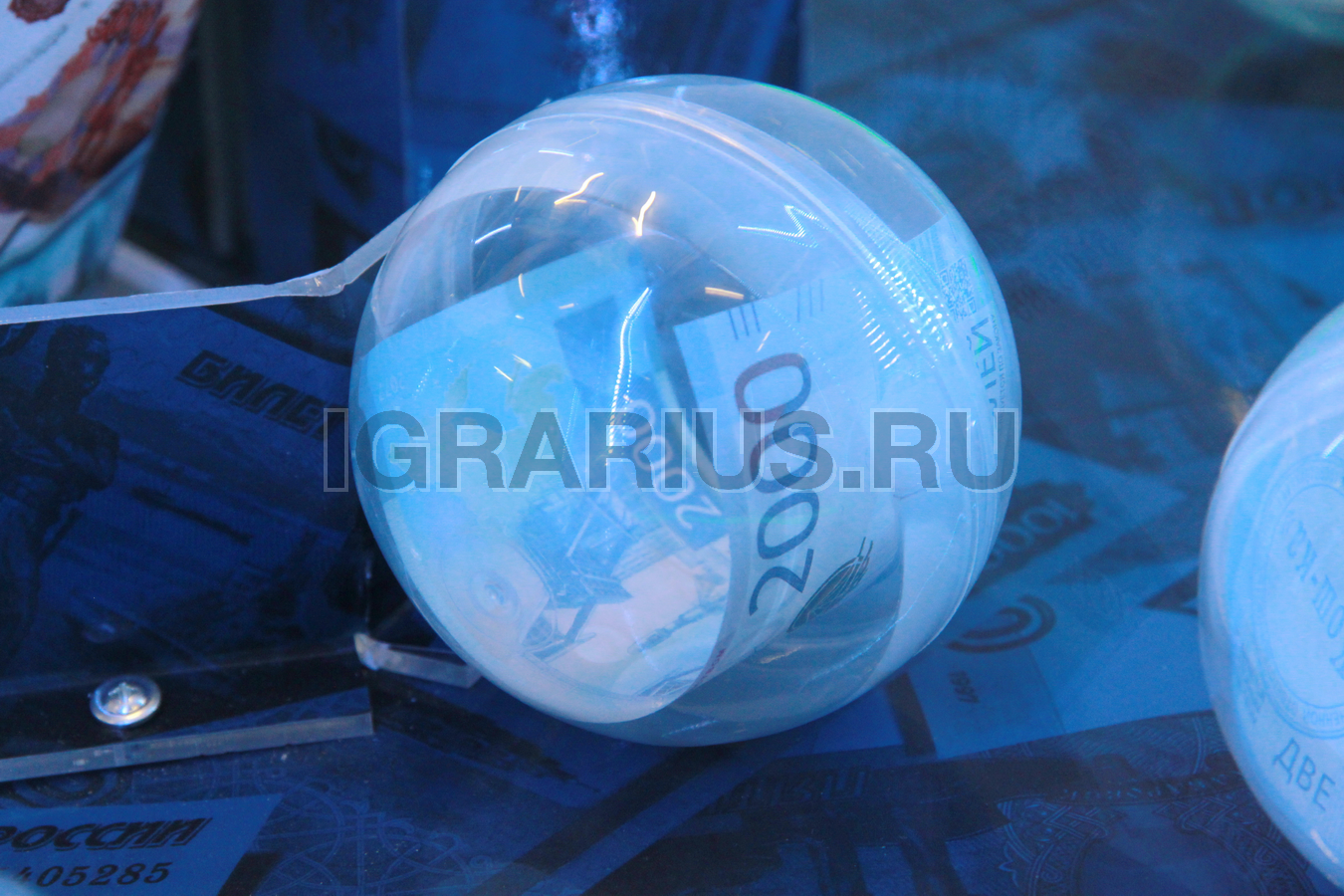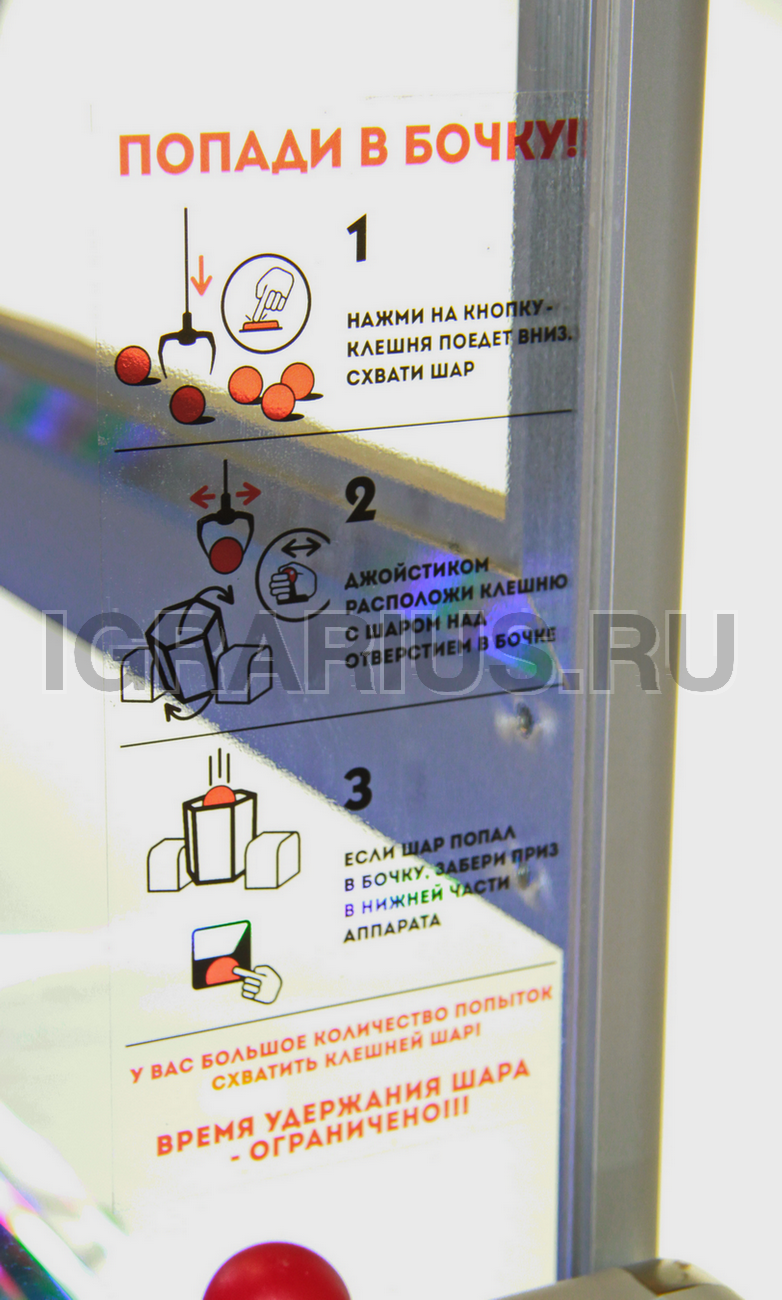Управляя клешней надо схватить шар и прицельно бросить его в крутящийся барабан. При точном попадании капсула выпадает в призовое окно. Крутящийся барабан по диаметру немного больше капсулы и попасть в него крайне сложно.
