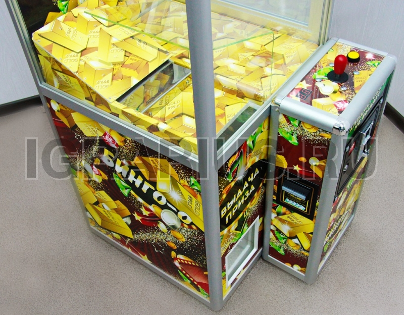 Аппарат очень интересен тем, что перед толкателем скапливается много игрушек, их можно выиграть сразу несколько за одну игру. Аппарат рассчитан под игрушки, шоколадки, конфеты, любые небольшие предметы.