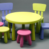 Столы пластиковые зеленые 4 шт., стол пластиковый синий 1 шт. табуретки пластиковые зеленые и желтые 20 шт., подушки 7 шт., альбомы для рисования, карандаши, раскраски