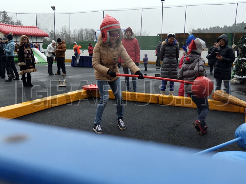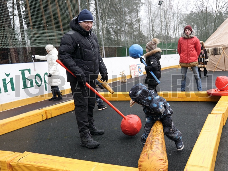 Старинная славянская забава, которая будет интересна всем гостям пришедшим на Ваш праздник. Каждый участник получает в руки, мягкое копье и щит, на голову одевается защитный шлем. Задача, используя щит и копье, столкнуть оппонента с брусчатого ринга. Игра напоминает битву мешками, но гораздо интереснее так как игровая площадка больше по размерам и реквизит намного продуктивнее.