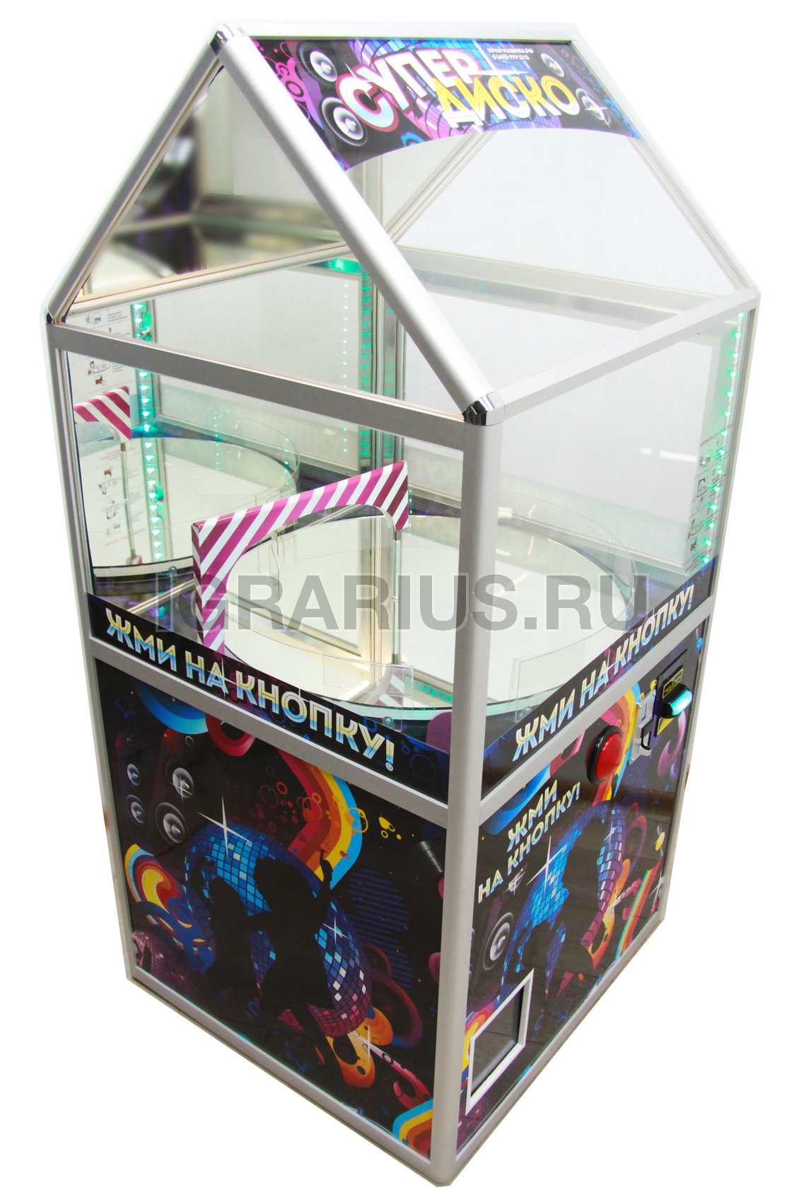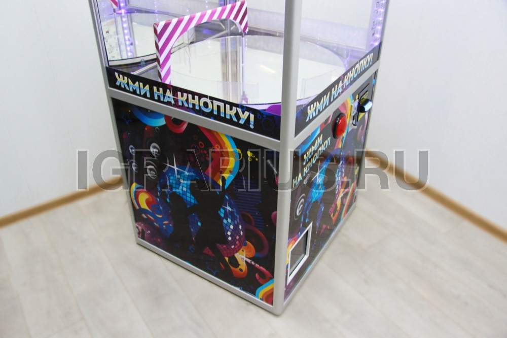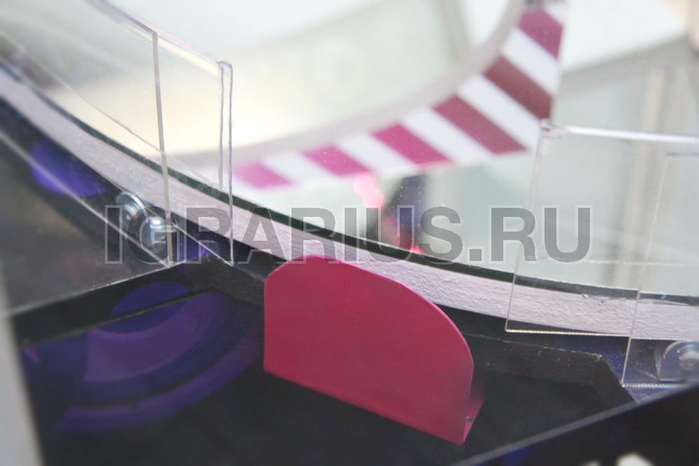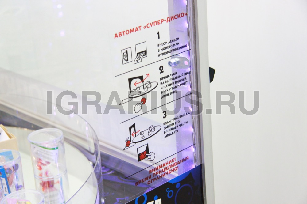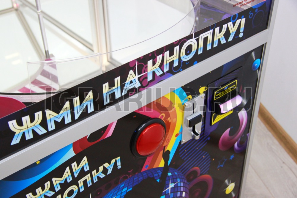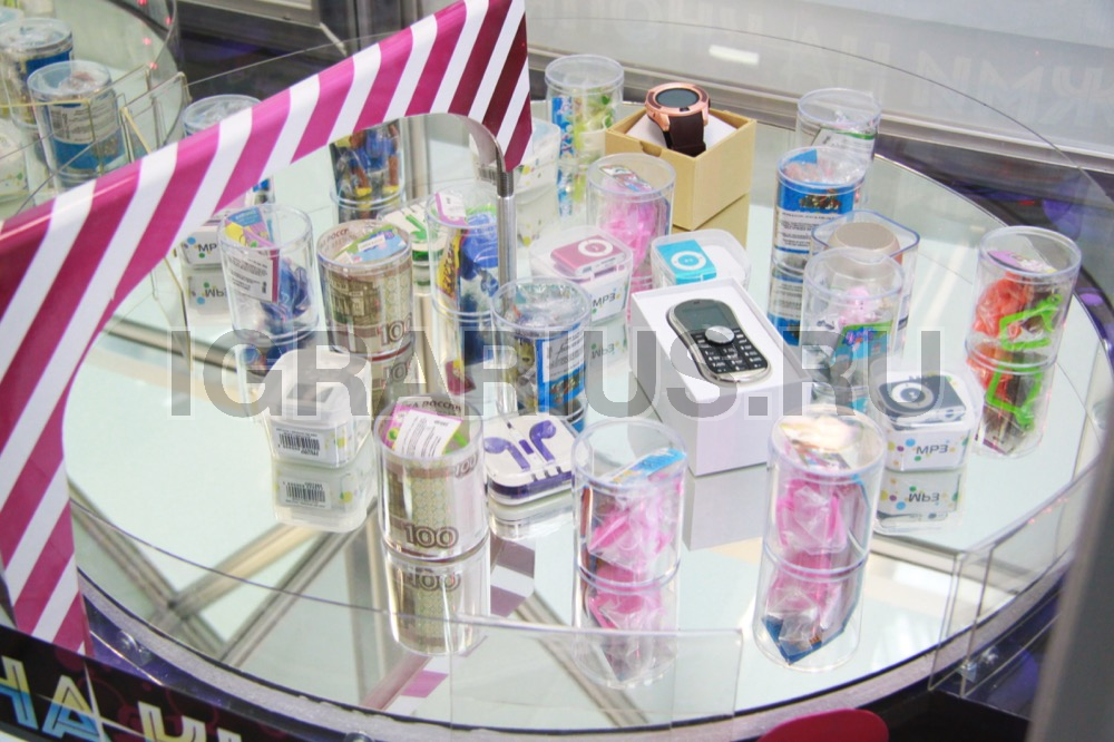 Толкатель поедет в сторону призового окна, и при точном попадании, столкнет приз.