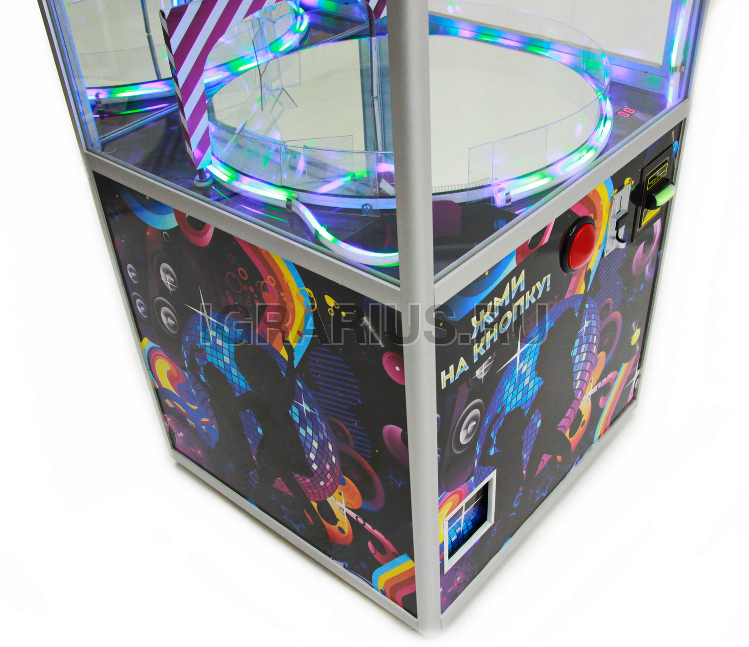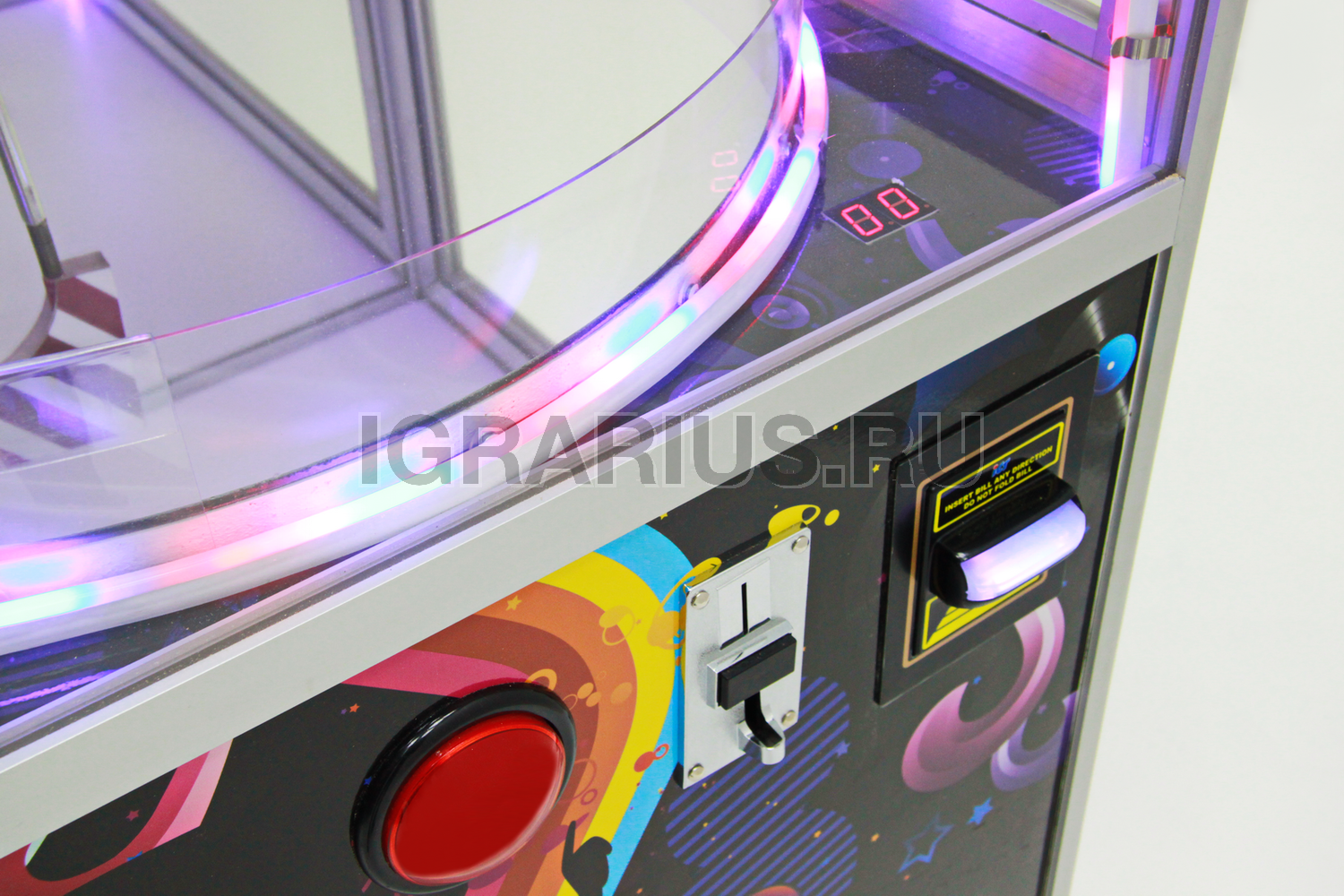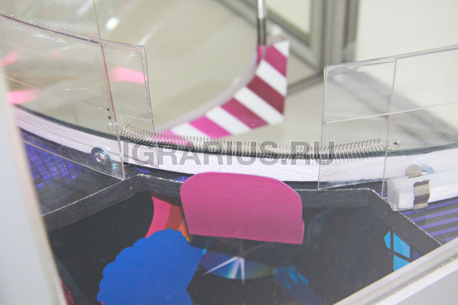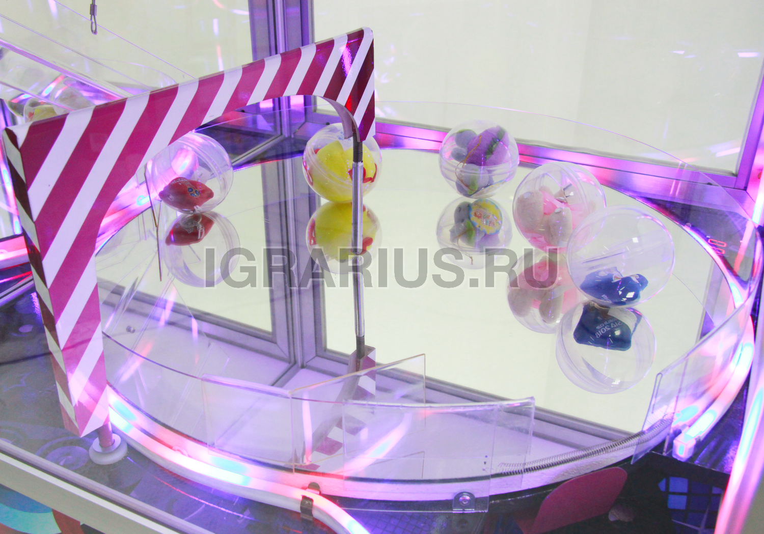 Толкатель поедет в сторону призового окна, и при точном попадании, столкнет капсулу в призовое окно.