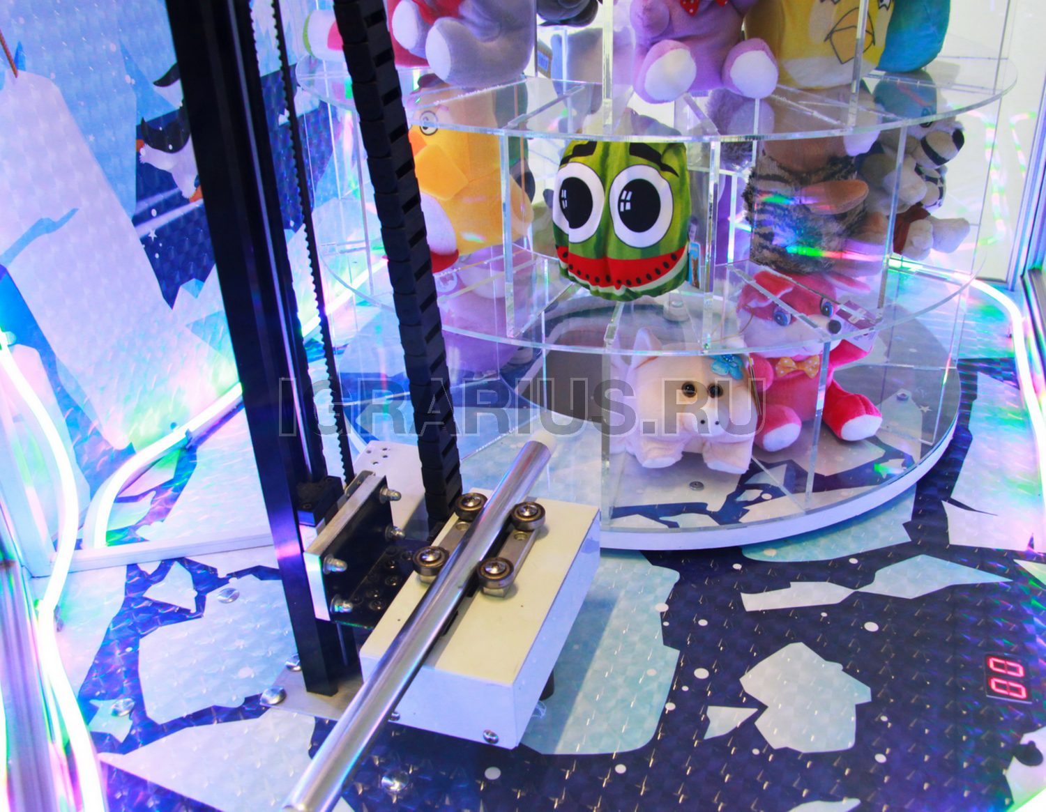 Задача игрока - нацелиться на отсек с понравившейся игрушкой, остановить барабан и каретку кнопкой, и попасть толкателем в игрушку.