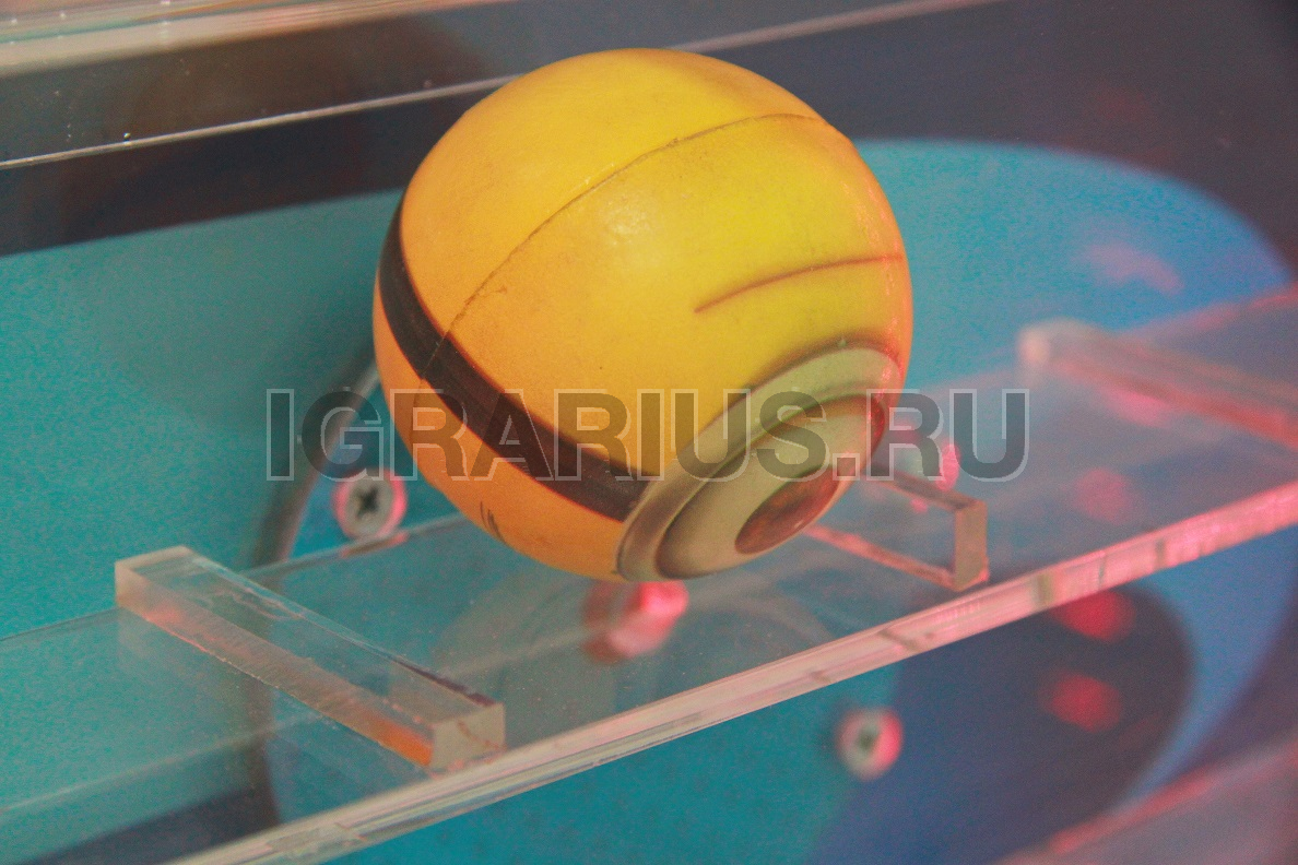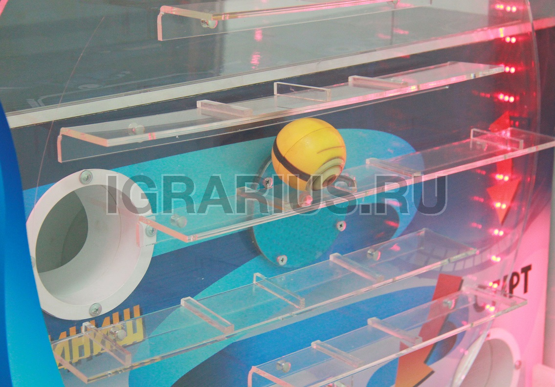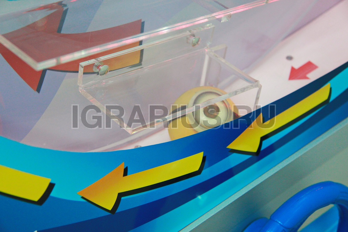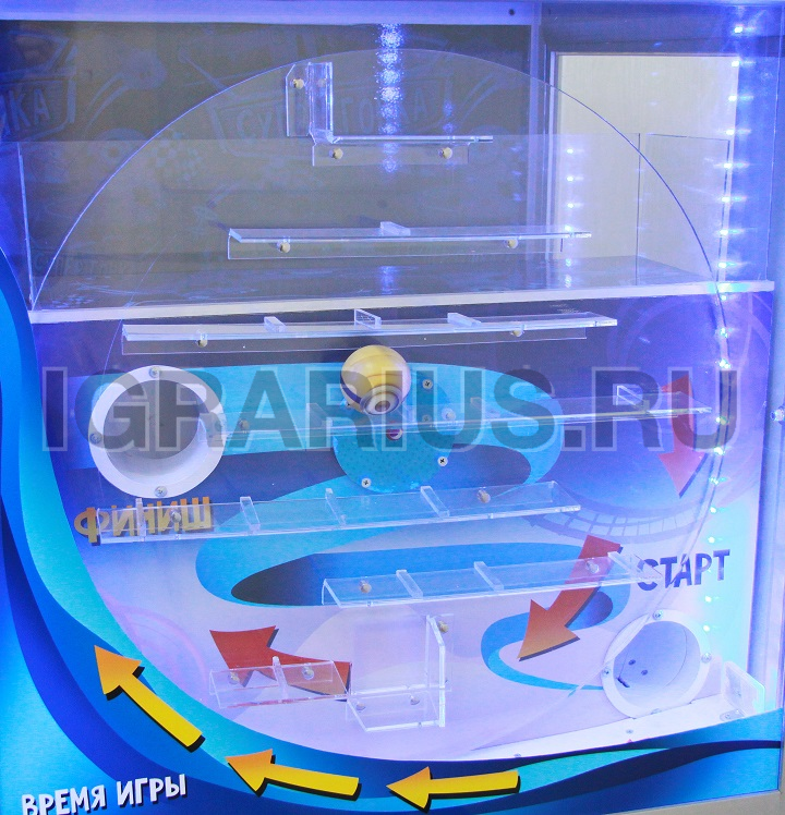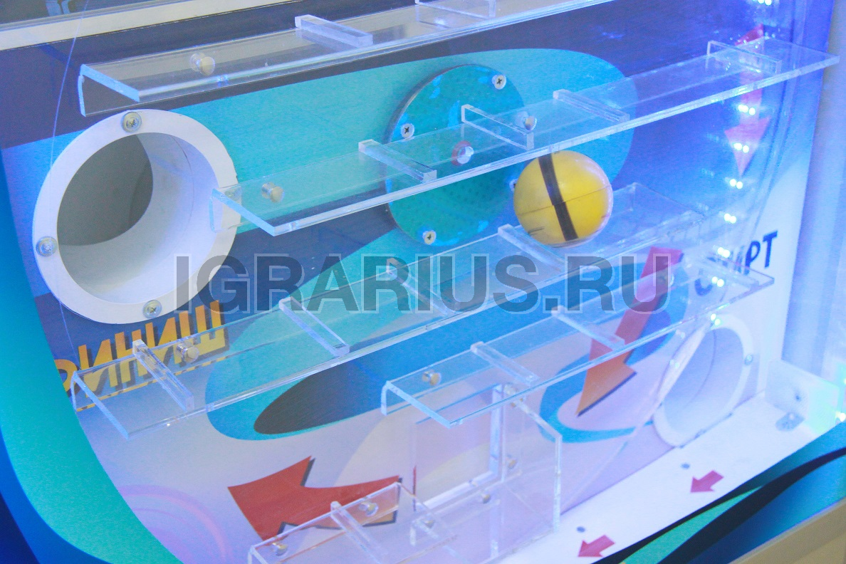 Двигая руль вправо/лево надо прокатить мячик по всем дорожкам, закатить в самый нижний кармат и направить карман с мячиком в верхнее окно финиша. Мяч попадая в трубу выкатится в нижней части на игровое поле, а в призовое окно выпадет шар с игрушкой.