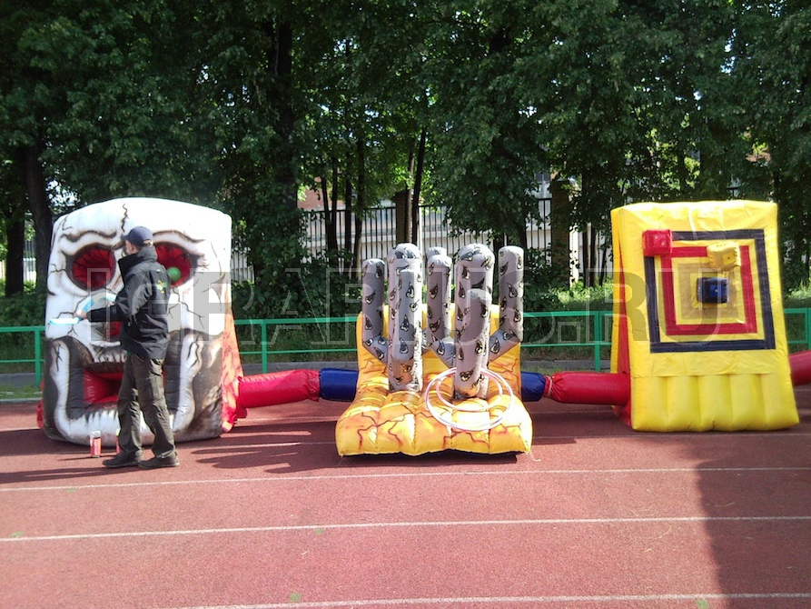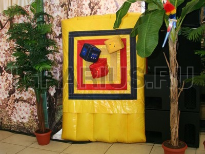 Кости: Перед Вами расположена надувная мишень, в руках три игральных кубика (игральные кости) с нанесенными метками на гранях от 1 до 6. Ваша задача бросить игральные кости на площадку таким образом, что бы кубик не отлепился от нее и набрать не менее 12 баллов, тот кубик, который не прилепился к поверхности мишени, не засчитывается. Задача не из простых и требует от игрока ловкости и умения.