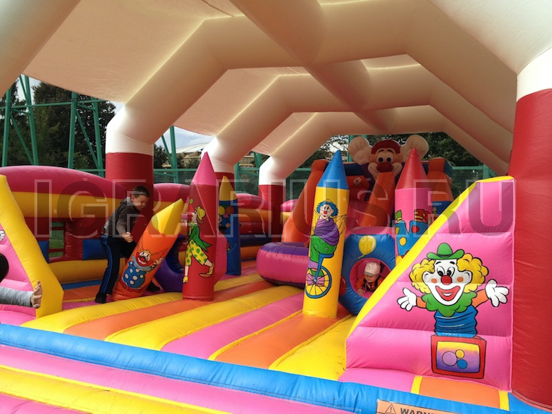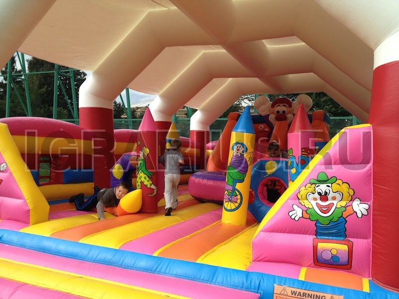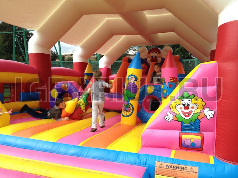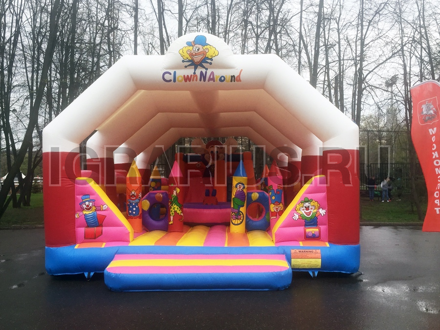 Надувной комплекс «Клоун» позволит вашим малышам попасть на фееричное выступление веселых клоунов и составить им компанию став участниками большого циркового шоу. Игровой комплекс оснащен мини-горкой и различными препятствиями для беззаботных прыжков со своими друзьями. Веселый цирк может принять на свою арену до 10 маленьких озорников одновременно. Батут оснащен легкой крышей и поэтому очень удобен в солнечную погоду, чтобы не перегреться и не получить солнечный удар, а так же не остановит веселье, если на улице небольшой дождь. Всепогодный центр развлечений детей готов приехать на праздник к Вам!