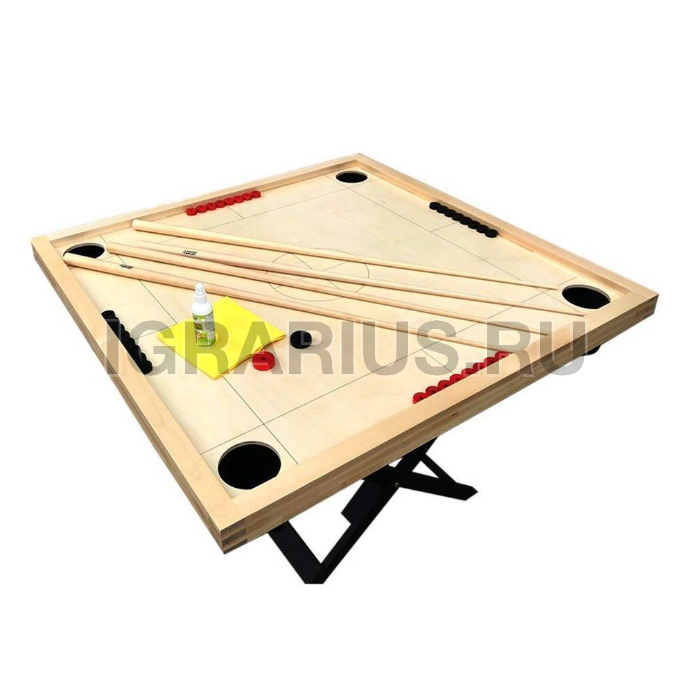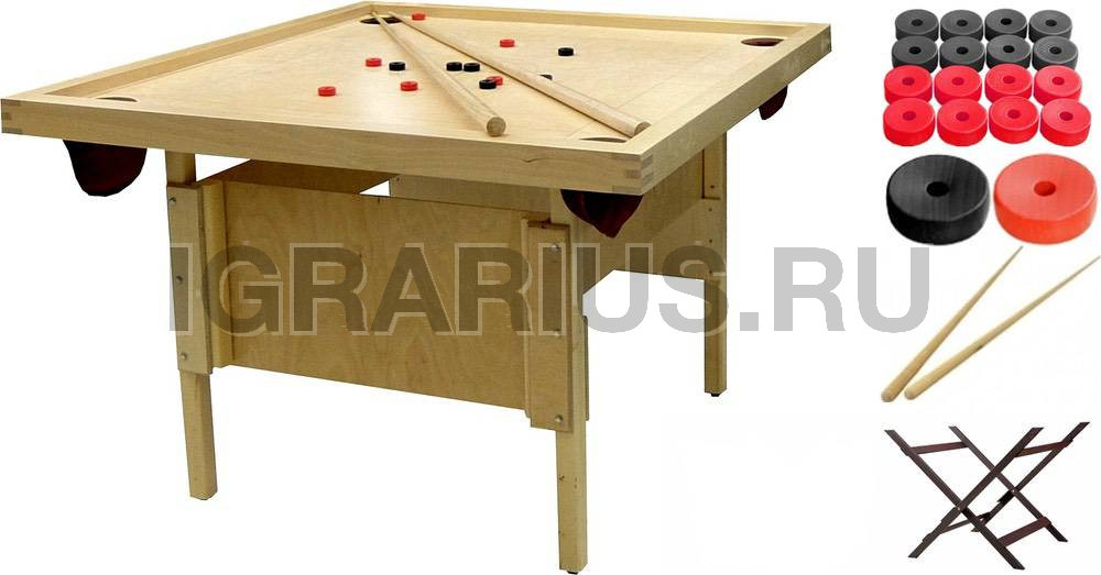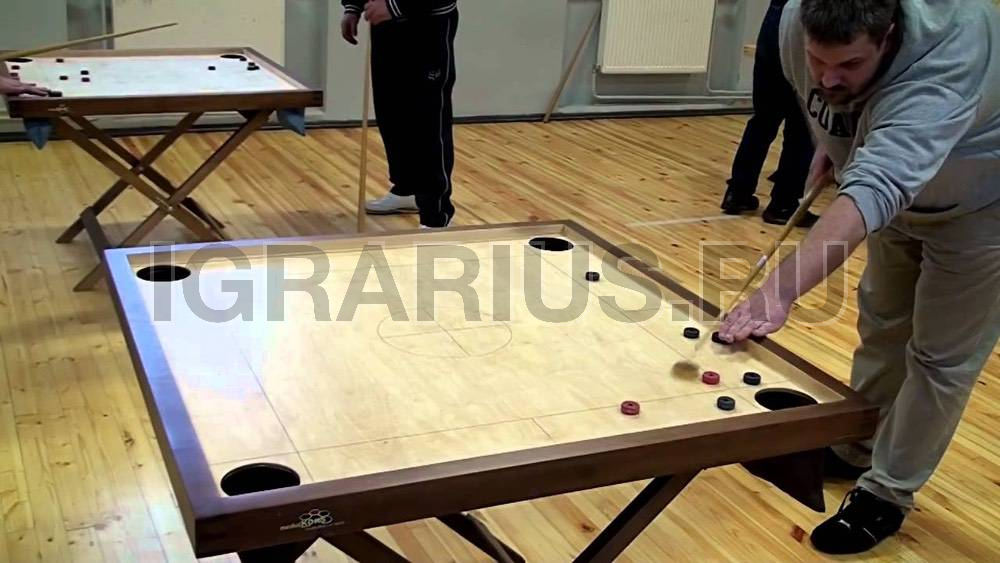 Эта игра носит множество названий, но принцип и правила у нее одинаковые. Игровой стол в форме квадрата разделён на четыре игровые зоны, в которых располагаются деревянные пешки двух цветов для каждого игрока. По углам игрового стола находятся четыре лузы. Задачей каждого игрока является с помощью игрового кия и битка «матки» загнать свои пешки, находящиеся на противоположном конце стола, в любую из четырёх луз. Удары по пешкам производятся по очереди.