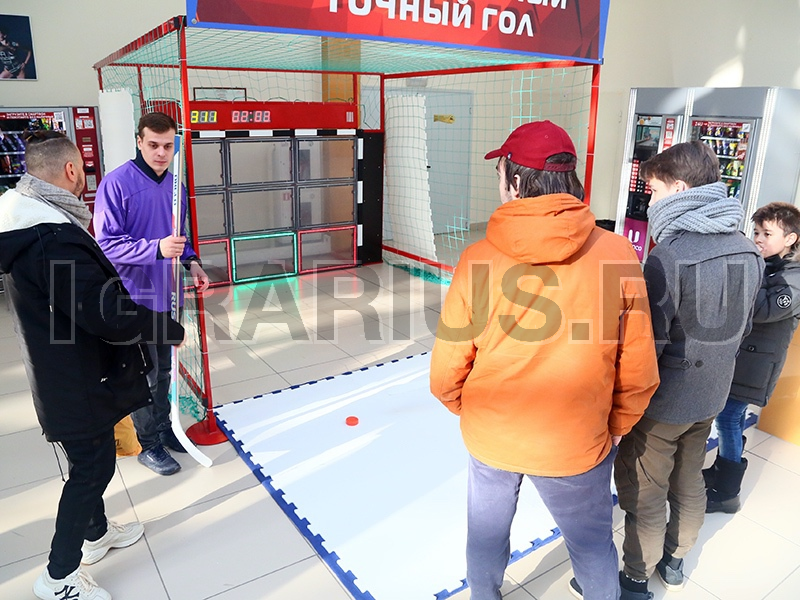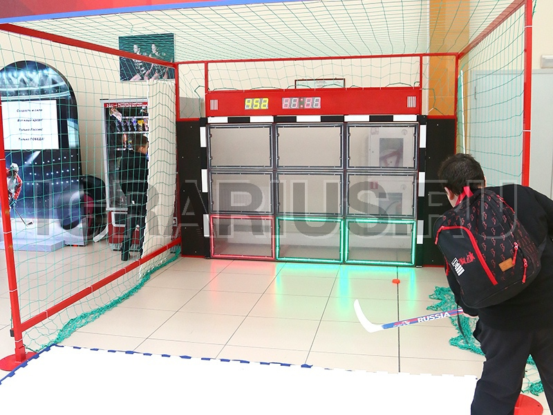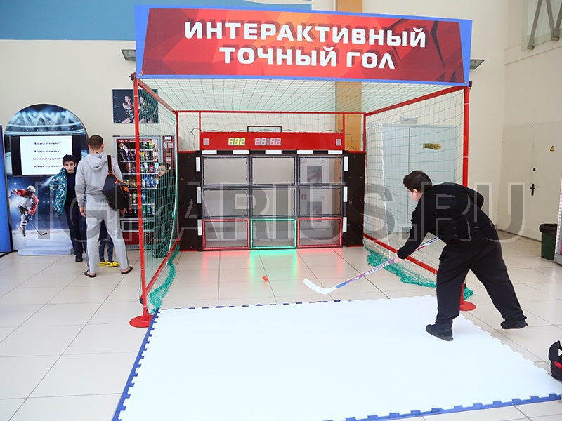 Интерактивный аттракцион «Точный Бросок» выполнен в виде хоккейных ворот и оснащен интерактивными панелями с подключенными датчиками, реагирующими на точное попадание. Аттракцион имеет 10 различных вариантов игр, которые привлекут внимание каждого посетителя Вашего мероприятия. Это уникальная новинка нашего проката, не имеющая аналогов в других агентствах. В комплект входит: интерактивная панель, стойки ограждения, сетка, набор шайб и клюшек, инструктор и искусственный лед!