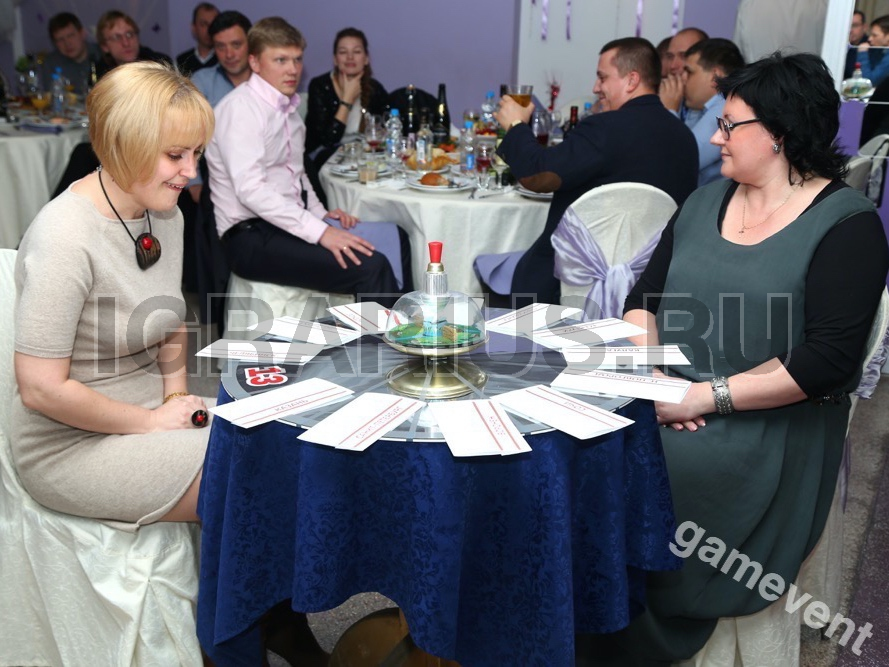 Мы предлагаем Вам по минимальным ценам полный антураж известного формата. А именно: оригинальную зеркальную накладку на любой стол с «волчком», два распорядителя Игры с гонгом, конверты для писем зрителей, черный ящик.