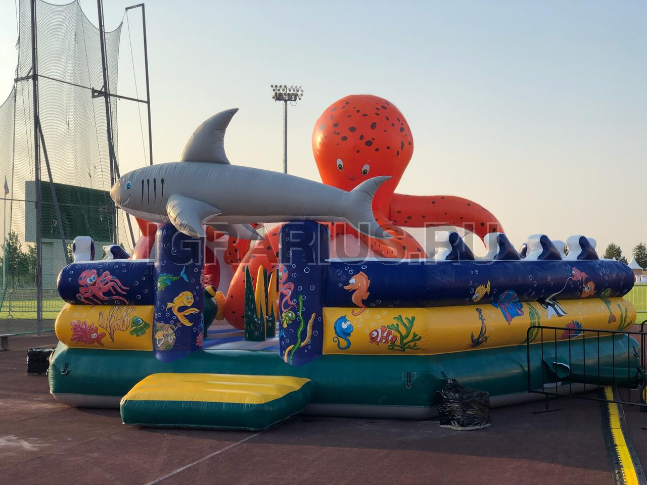Аттракцион мир, для детей любого возраста! Можно не только прыгать, но и лазать по всевозможным морским обитателям, не боясь удариться, ведь высокий борт, со всех сторон окружающий площадку, надежно защищает детей.