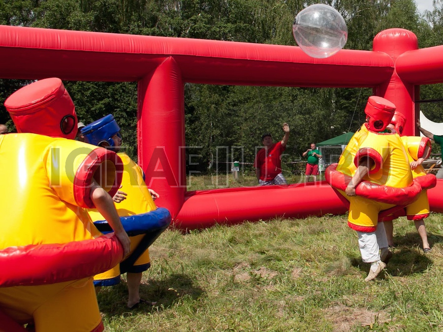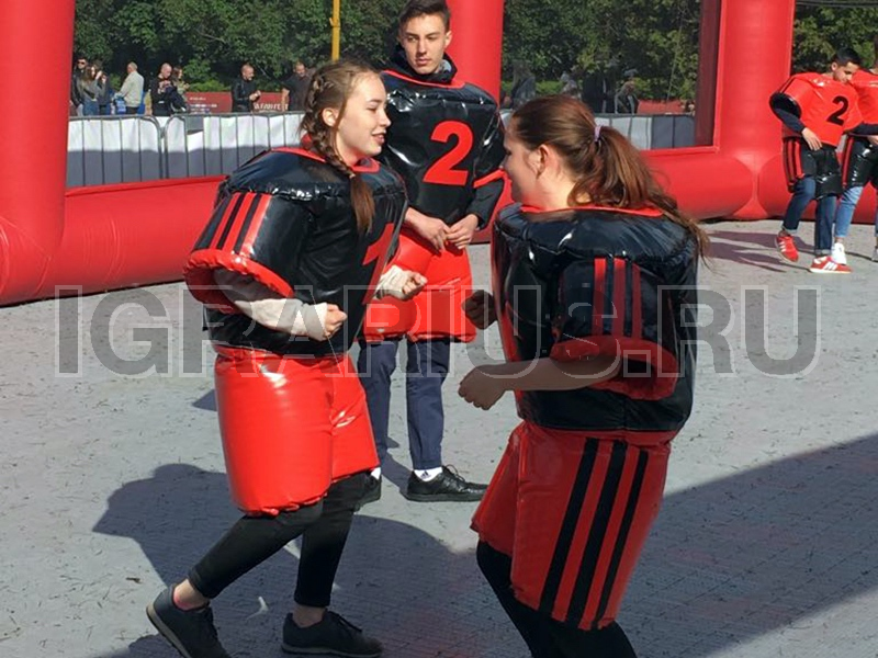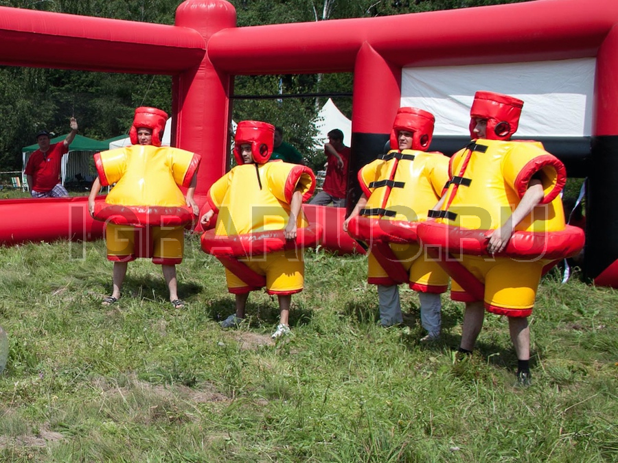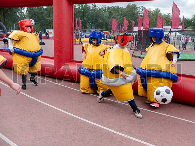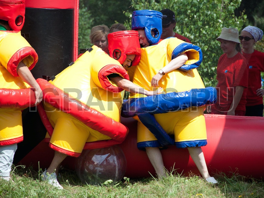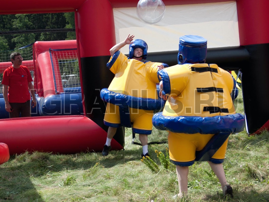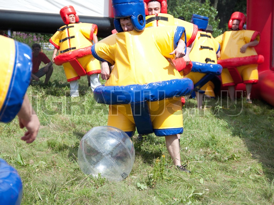 Два тайма по десять минут - и вы похудеете на пару килограммов. Очень смешное зрелище не только для тех, кто смотрит, но и для самых футболистов. В комплект входят 8 костюмов на две команды по 4 человека. Сумобол входит в десятку самых смешных футбольных аттракционов, наряду с ботоболом, футболом с гигантским мячем, фктбольным сумо и т.д. Закажите антистрессовую игру в сумобол на ваш корпоративный праздник и станьте легче как в эмоциональном плане, так и в физическом.