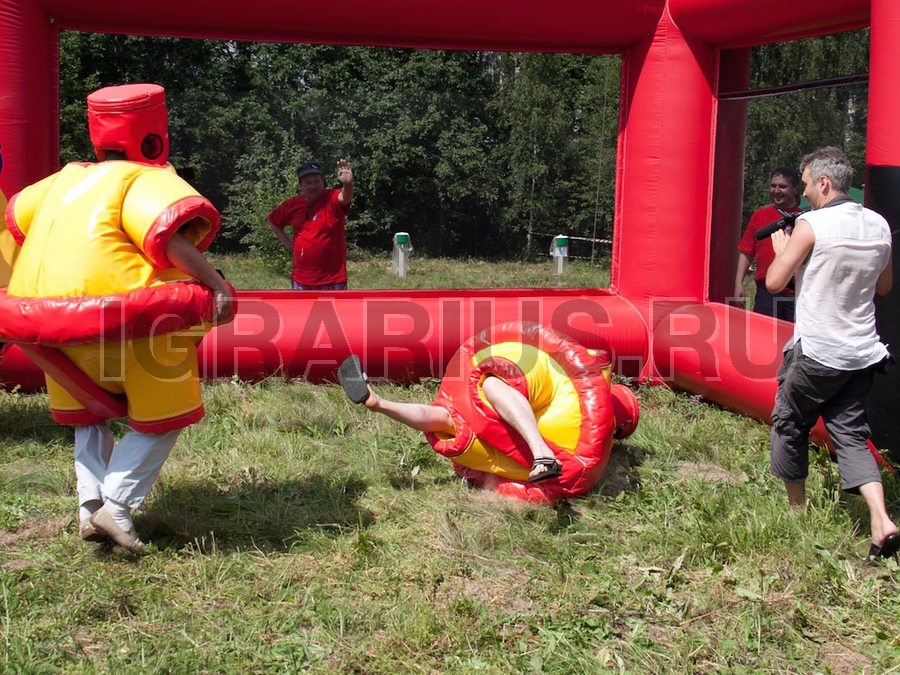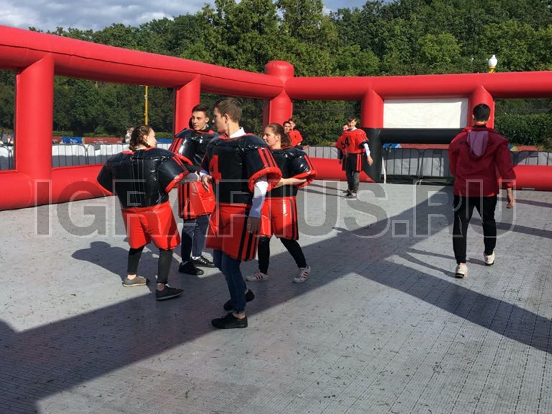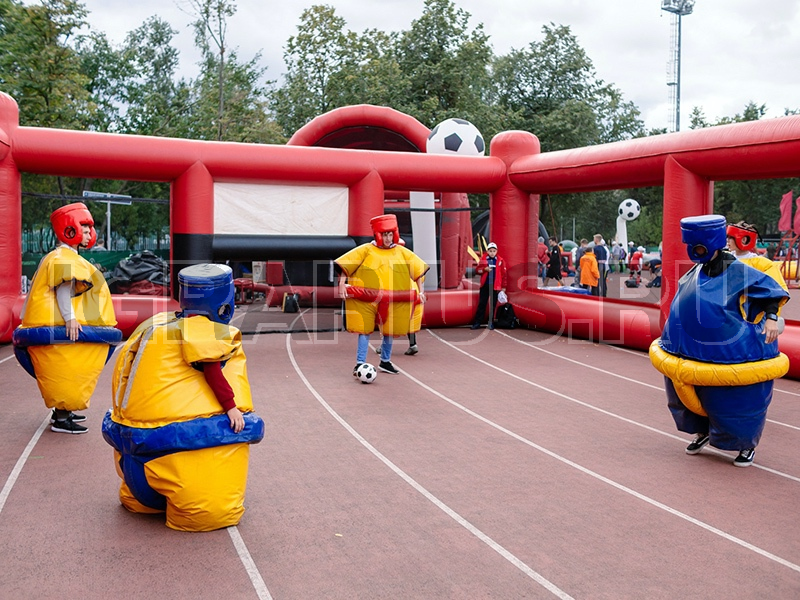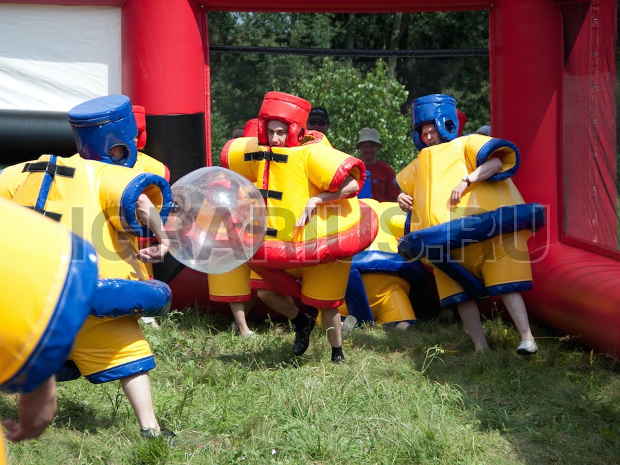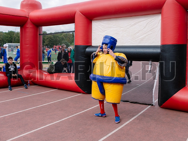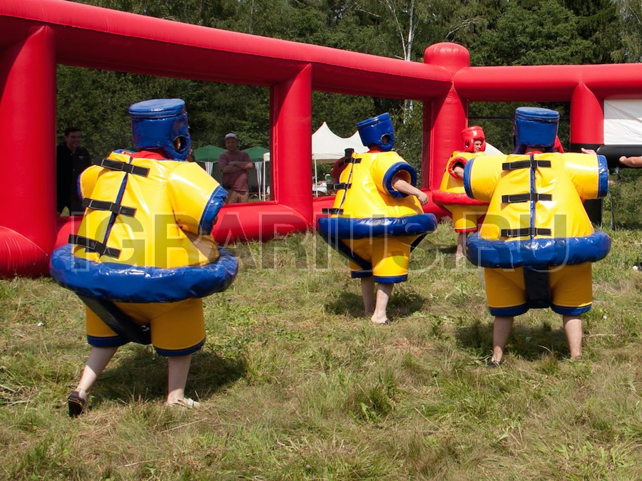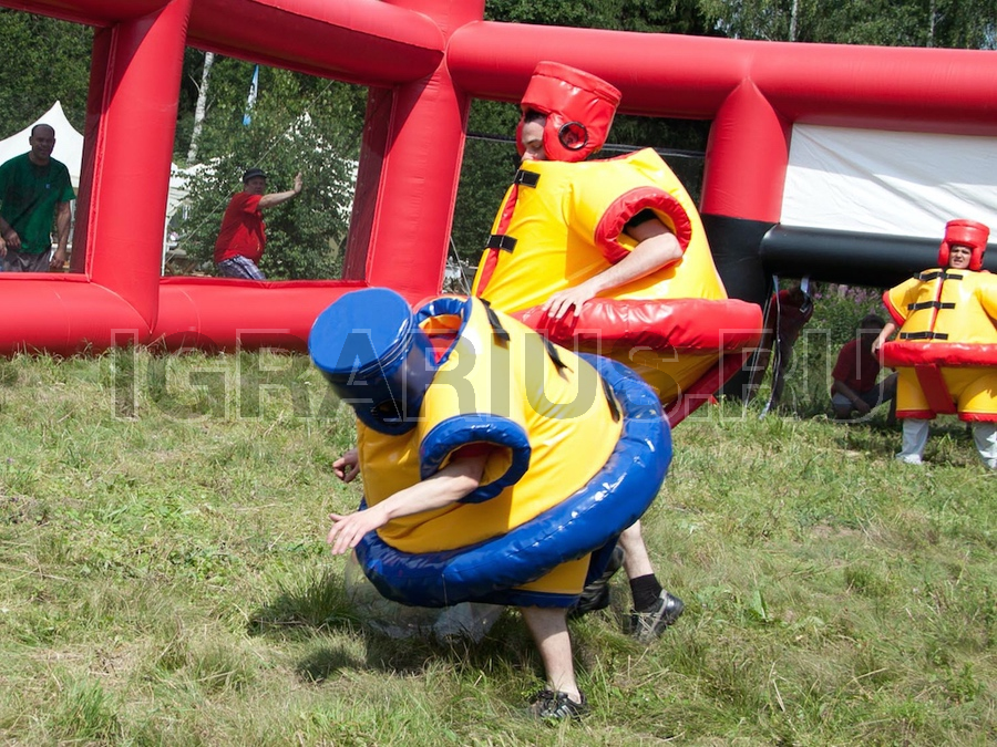 Два тайма по десять минут - и вы похудеете на пару килограммов. Очень смешное зрелище не только для тех, кто смотрит, но и для самых футболистов. В комплект входят 8 костюмов на две команды по 4 человека. Сумобол входит в десятку самых смешных футбольных аттракционов, наряду с ботоболом, футболом с гигантским мячем, фктбольным сумо и т.д. Закажите антистрессовую игру в сумобол на ваш корпоративный праздник и станьте легче как в эмоциональном плане, так и в физическом.