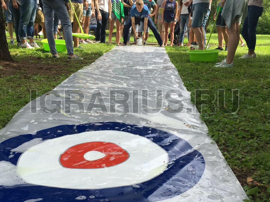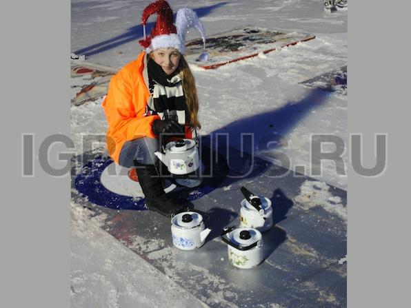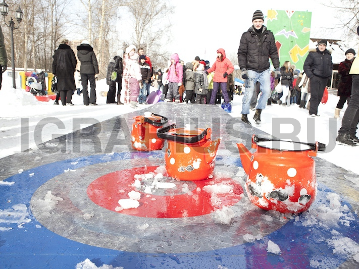 Самая настоящая игра в кёрлинг, но вместо камней традиционные чайники. Отличная забава для любого мероприятия, можно играть в любое время года, на любой ровной площадке . Участники делятся на две команды. У каждой команды чайники (камни) своего цвета. Необходимо занести как можно больше камней в дом на специально оборудованном поле.
