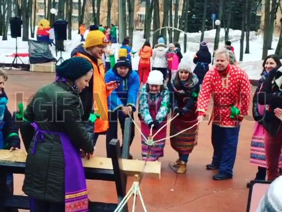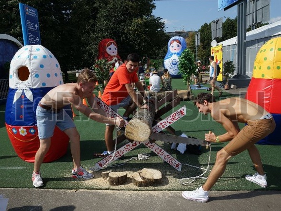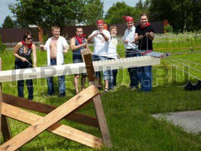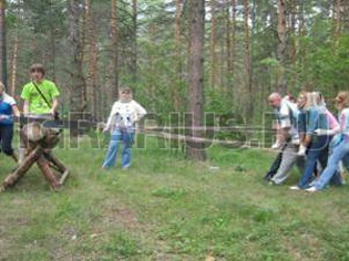 Традиционное задание для TeamBuilding на слаженность команды и умение работать как одно единое целое. Задача распилить бревно двуручной пилой, но не держась за ручки, а управляя пилой с помощью веревок выполняющих роль ручки. В каждой команде участвуют пять человек.