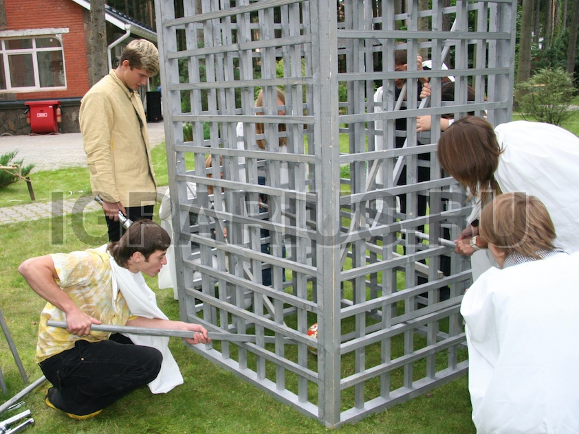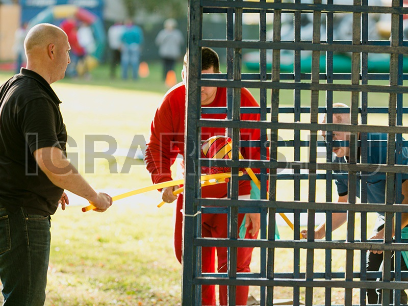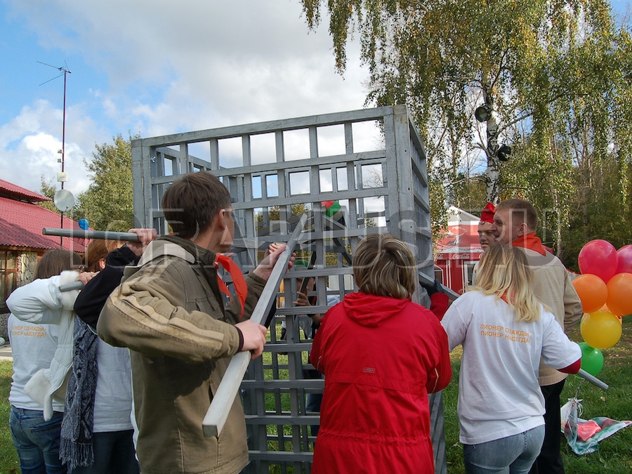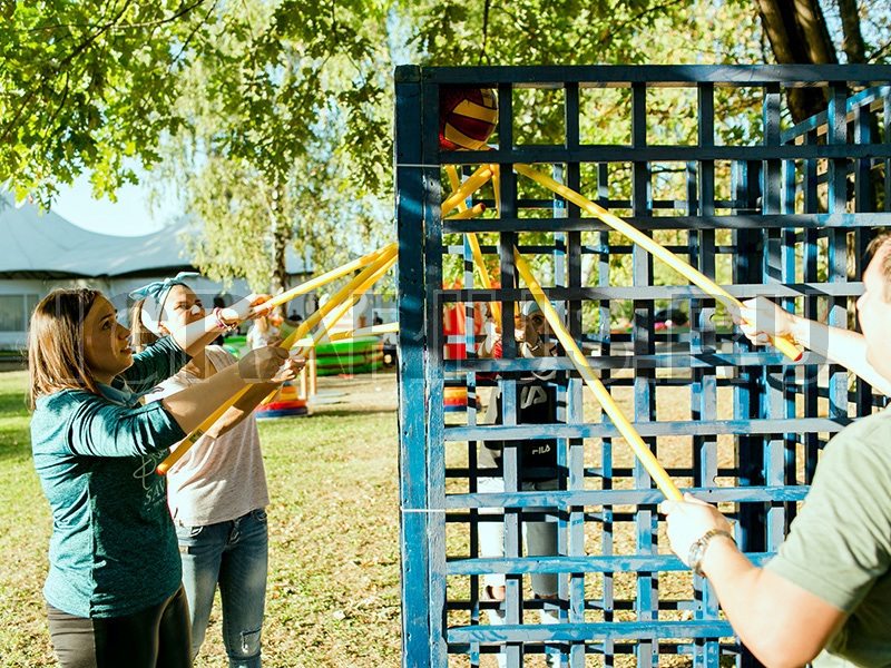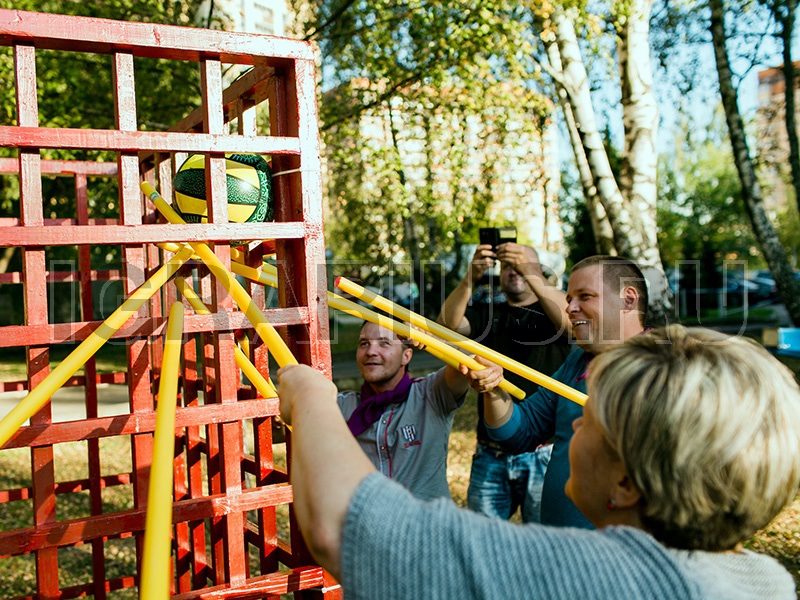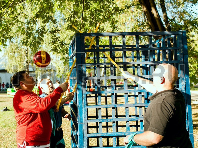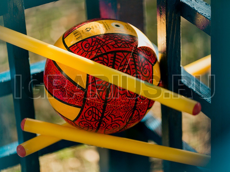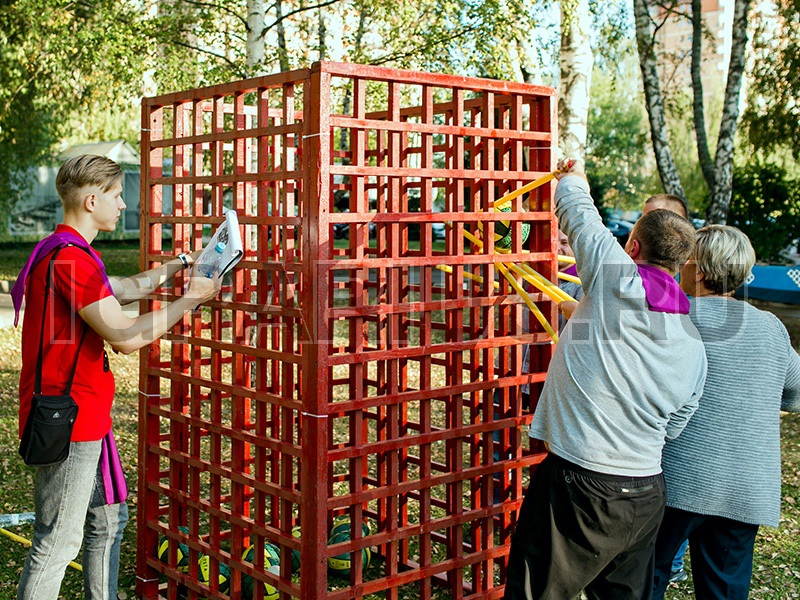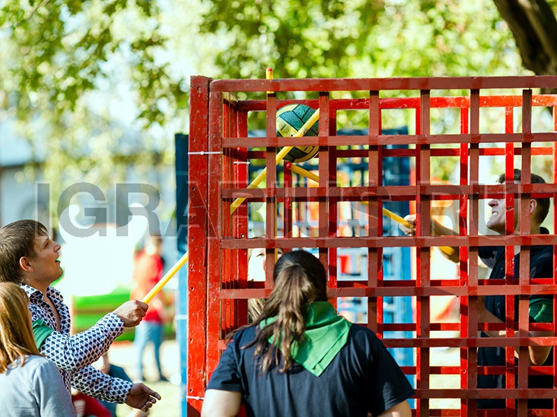Суть конкурса проста: у каждого из участников в руке по одной палке (одна палка на участника ). Нужно достать мяч из клетки...НО при этом необходимо выполнять специальные условия этого дружного задания. Та команда, которая первая вытащит мяч - побеждает.