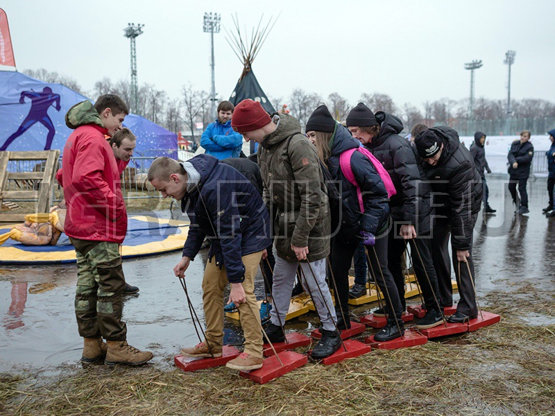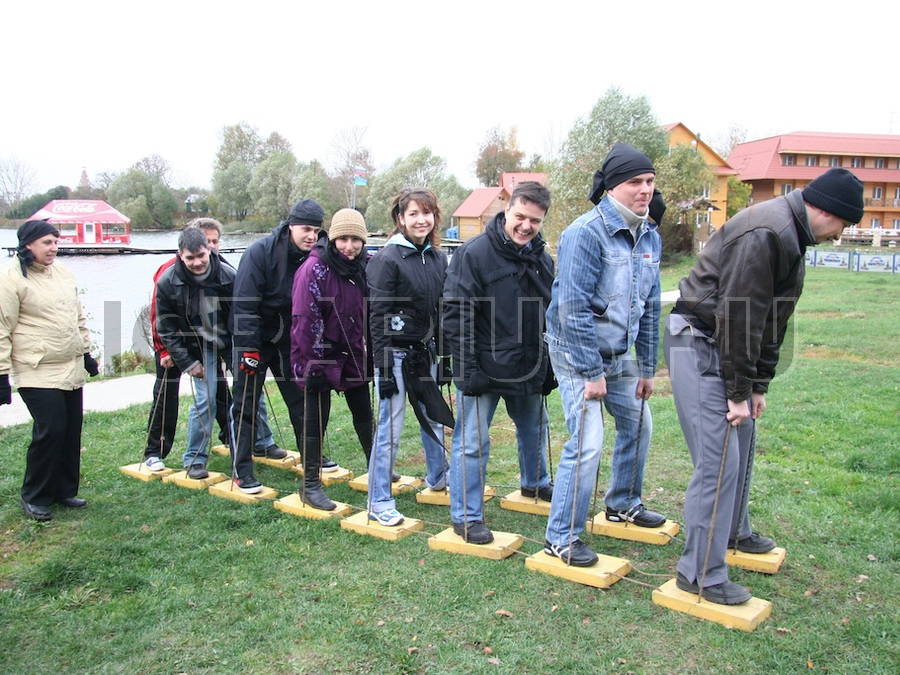 С помощью специальных дощечек команде необходимо пройти непростую дистанцию. Суть в том, что эти дощечки скреплены между собой, и, чтобы победить, команде необходимо максимально слаженно двигаться. Отличный командо-образовательный тренинг, который формирует совместную деятельность.